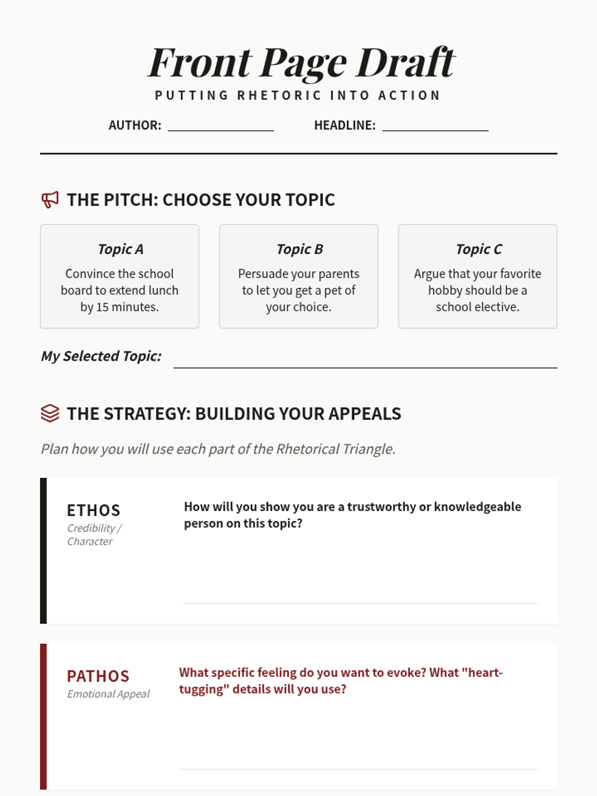 A worksheet for students to apply their understanding of ethos, pathos, and logos by drafting their own persuasive argument. Features topic prompts, a planning organizer, and an opening paragraph draft area.
