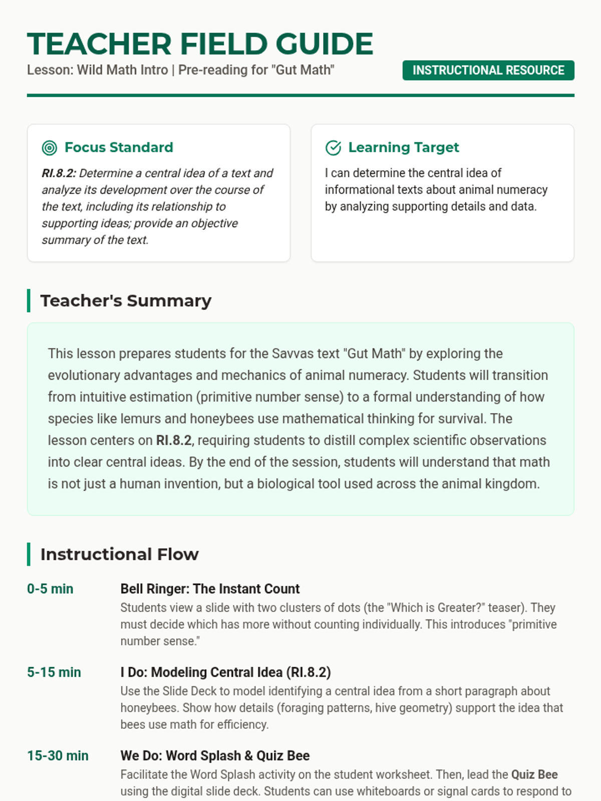 A comprehensive teacher's guide for the 'Wild Math Intro' lesson, featuring an instructional flow, standards alignment (RI.8.2), and a detailed answer key for the Quiz Bee and discussion questions.