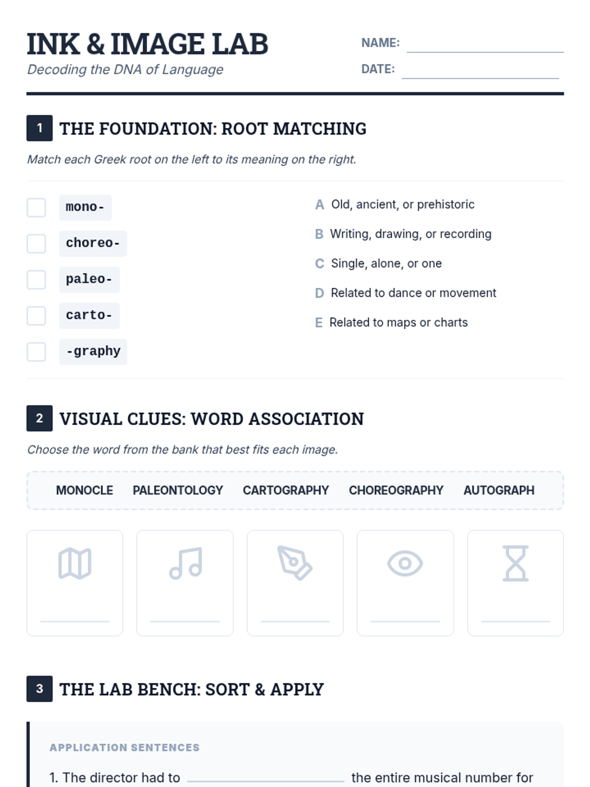 A practice worksheet for high school students focusing on Greek roots (mono, choreo, paleo, carto, graphy) through matching, visual association, and sentence application.