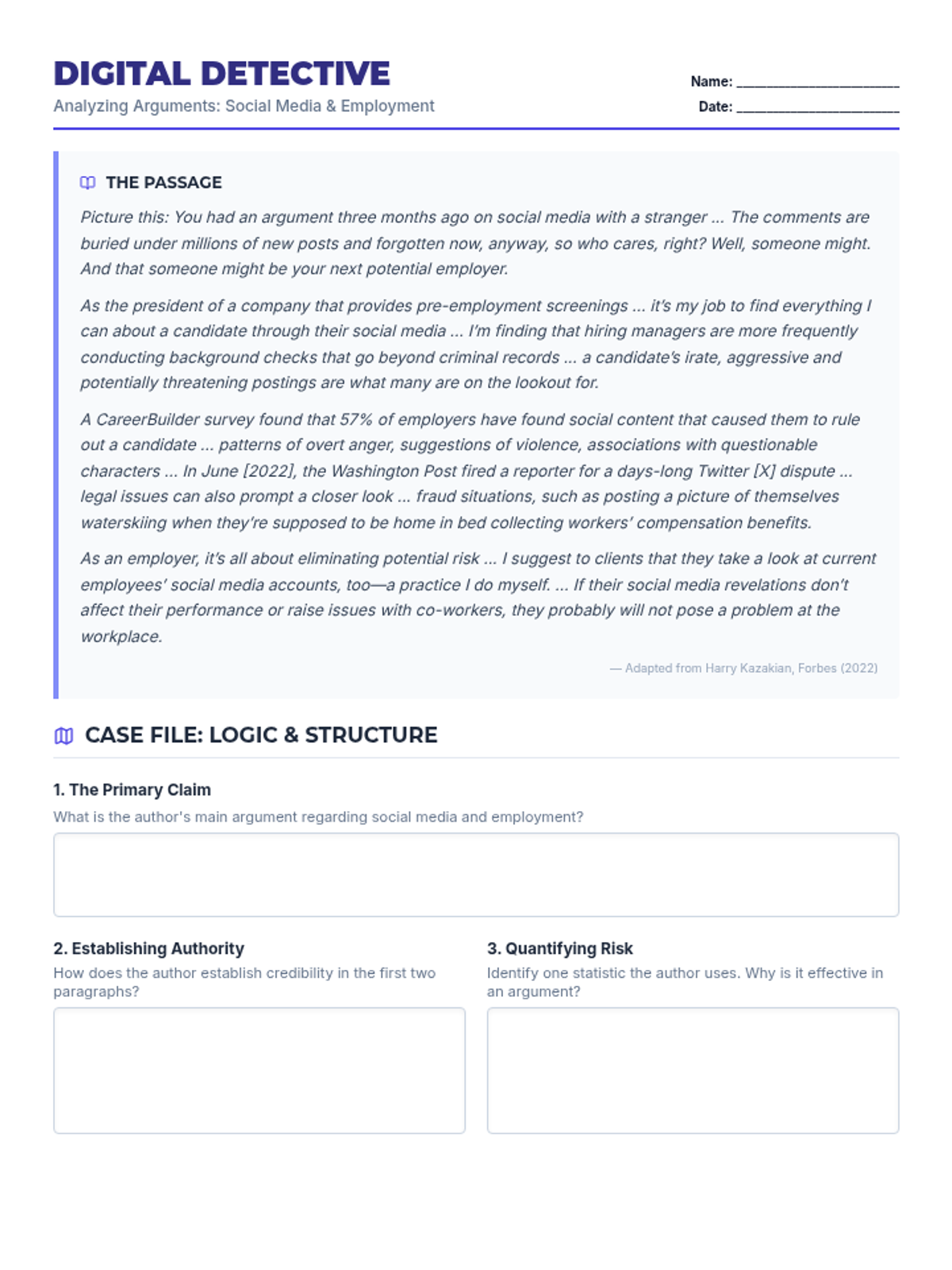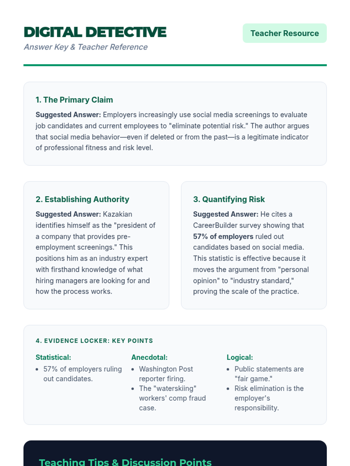 A comprehensive answer key and teacher reference for the Digital Detective worksheet, including suggested answers and discussion points.
