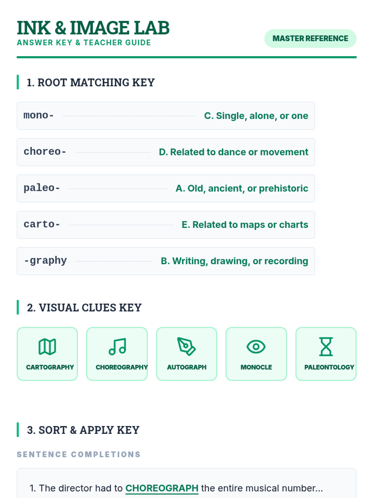 Complete answer key and teacher reference guide for the Ink & Image Lab root word worksheet.