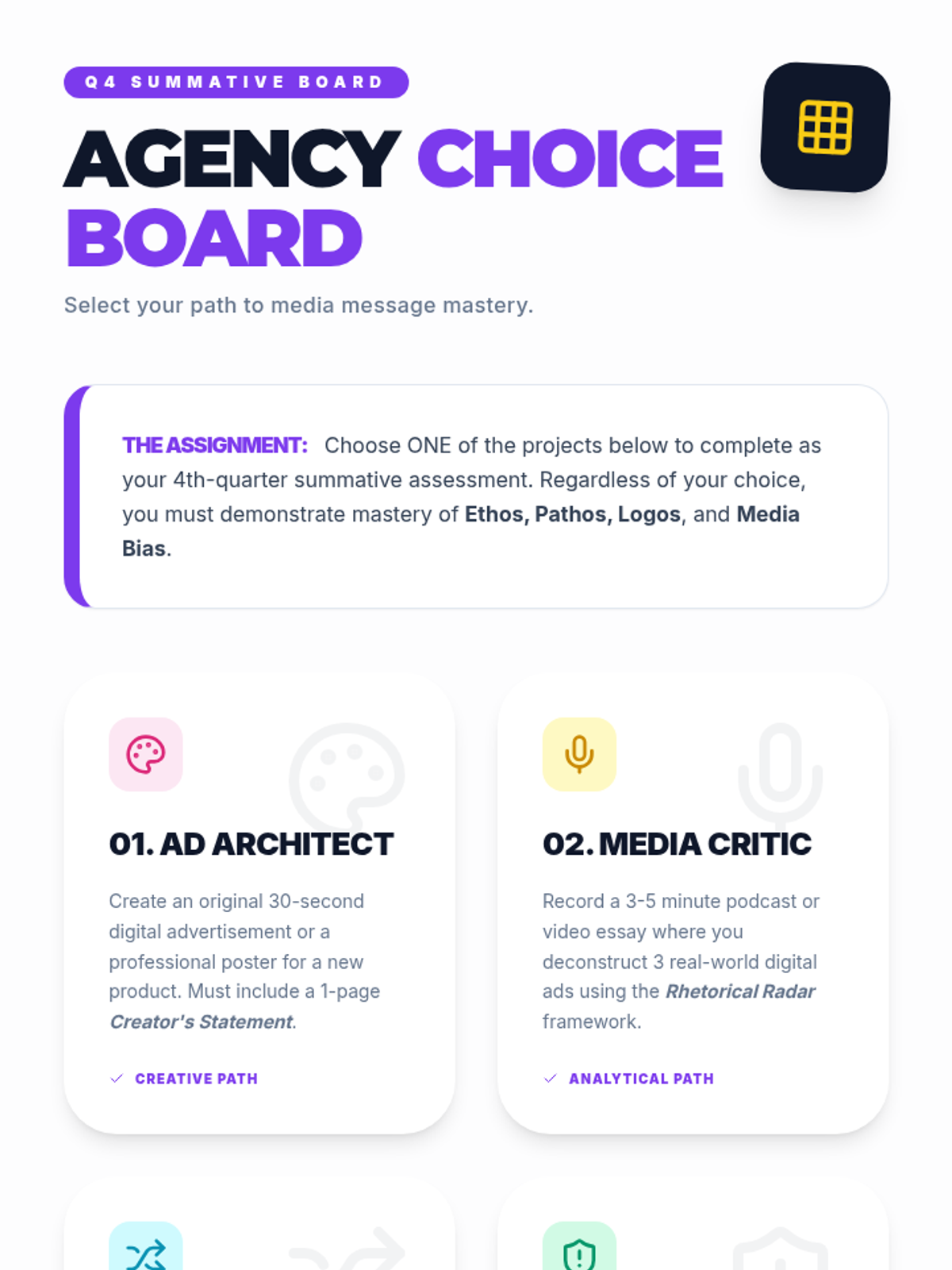 A complete, high-energy instructional slide deck for the Media Message Mastery lesson. Includes learning standards, I Do/We Do/You Do sections, Gallery Walk instructions with Post-It feedback, and a highly engaging collaborative "Agency Showdown" activity. Designed with a vibrant Canva-inspired aesthetic.