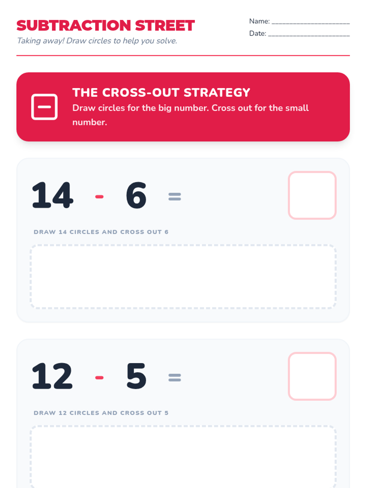 A subtraction worksheet with large integrated drawing spaces for each problem, ensuring students can use visual strategies effectively on a single page.
