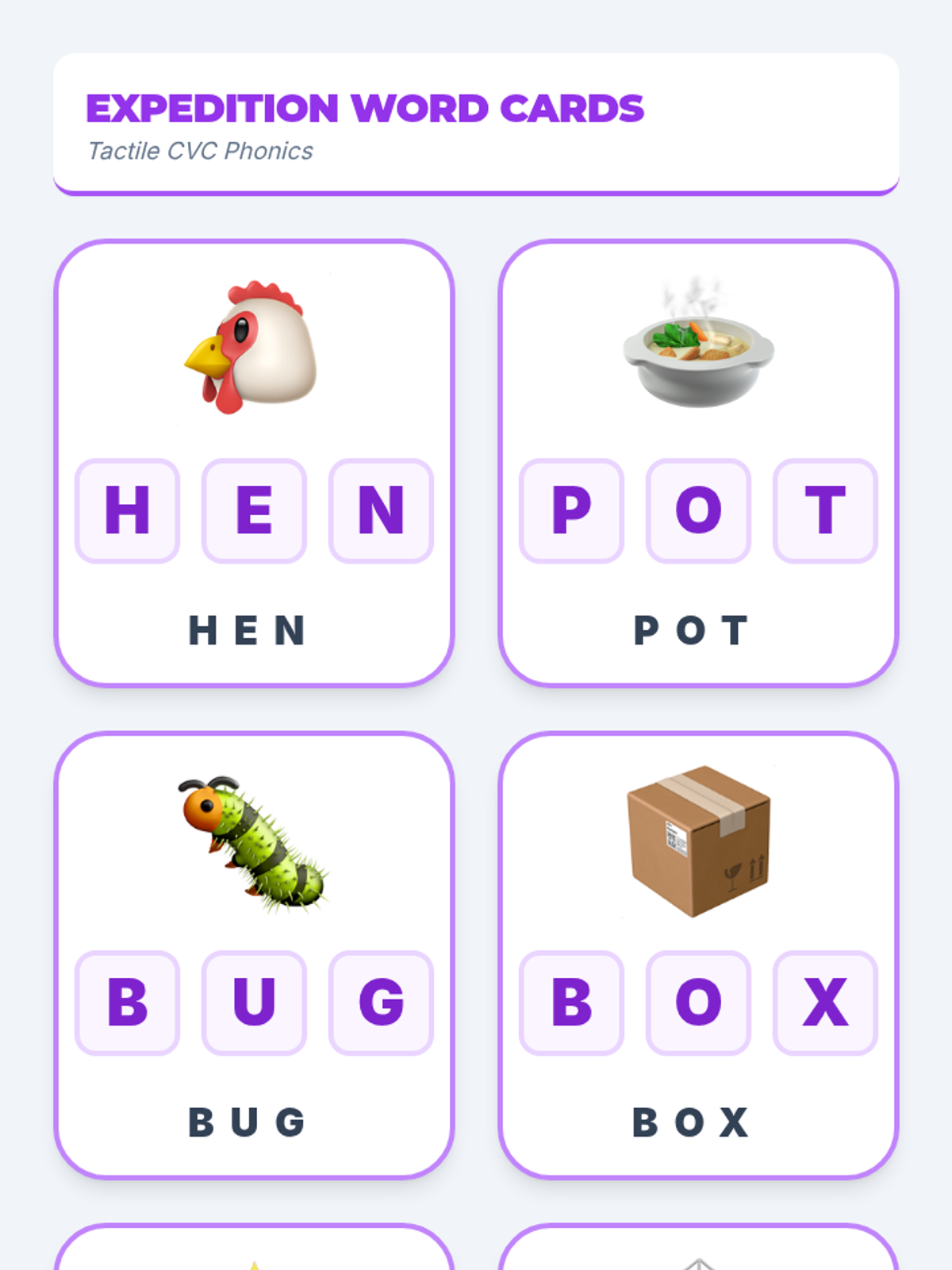 A standardized set of tactile CVC word cards featuring 'HEN', 'POT', 'BUG', 'BOX', 'SUN', and 'NET', designed for sensory-friendly blending practice.
