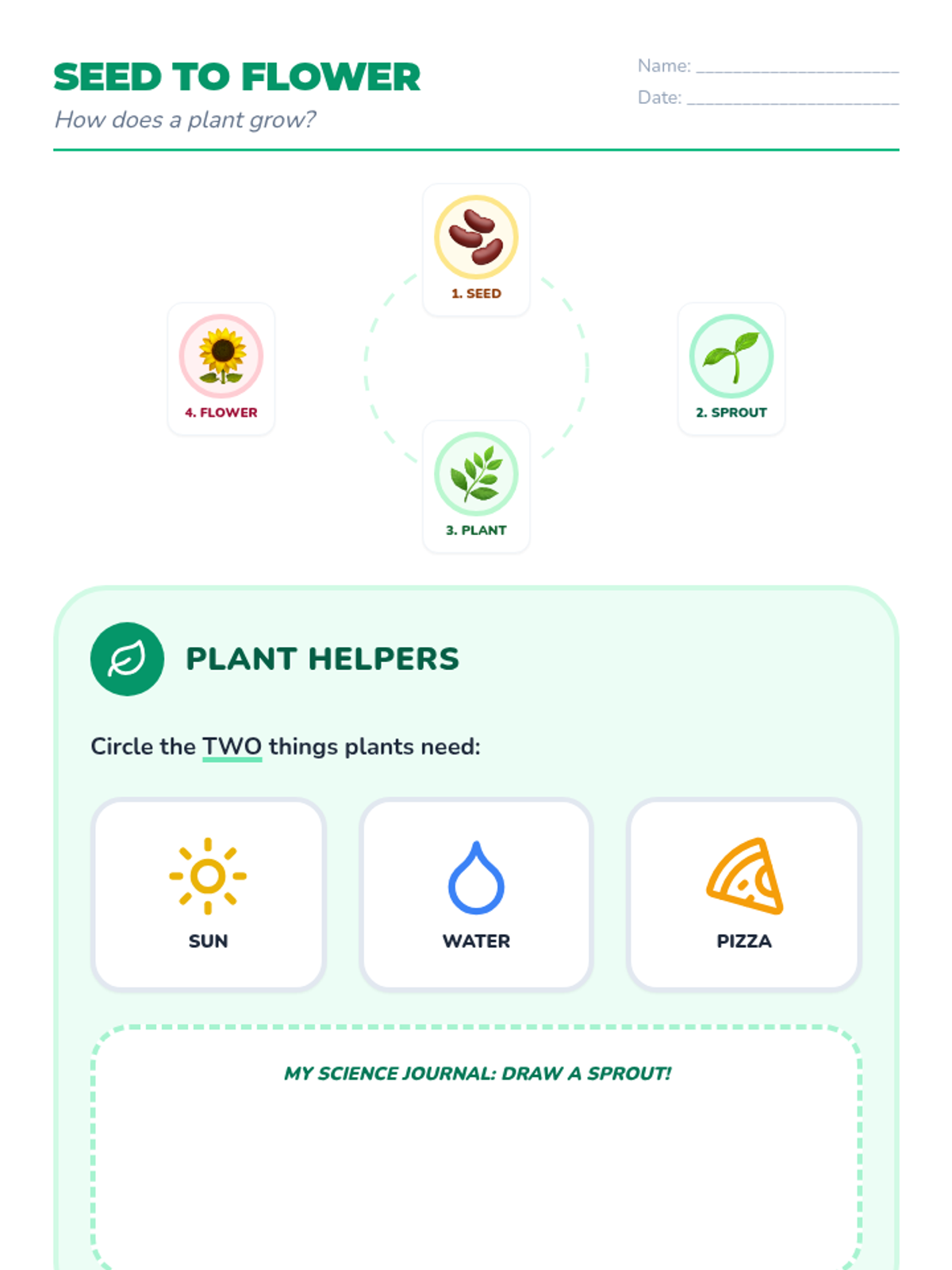 A visual science worksheet for the plant life cycle, featuring a consolidated single-page layout with large icons and a drawing space for student observation.