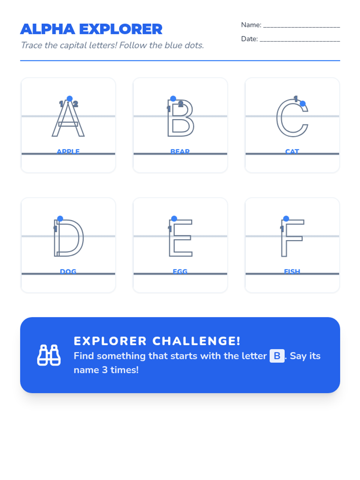 A letter tracing document for capital letters A-F, featuring high-contrast outlined letters, start dots, and directional guides on primary-style handwriting boxes.