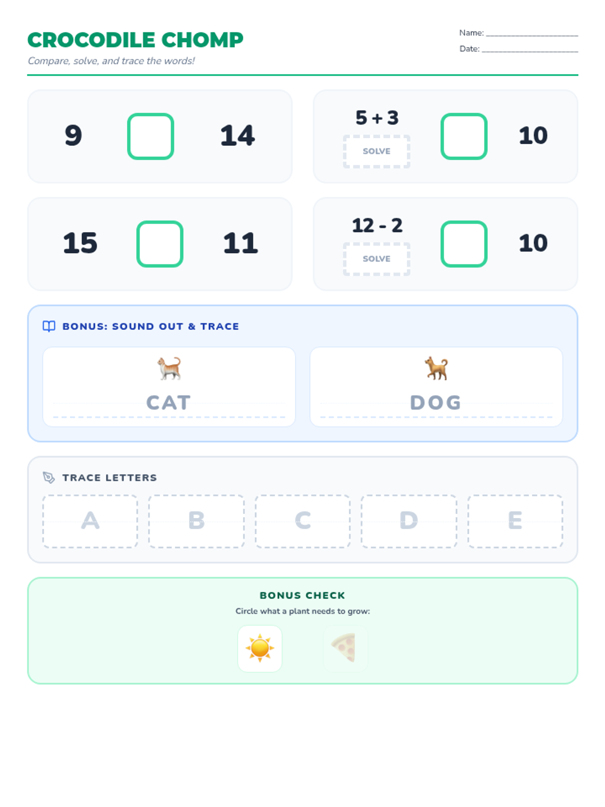 A comprehensive mixed practice worksheet for comparing numbers/expressions, capital letter tracing, and CVC word tracing, featuring high-contrast guides and integrated science check.