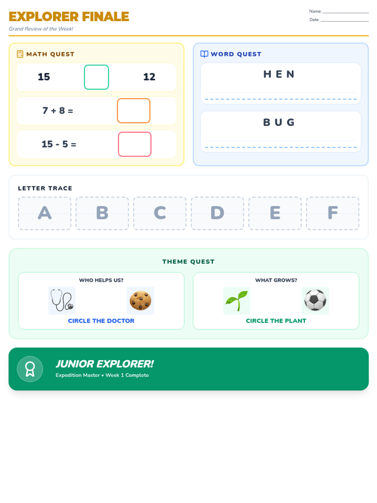 A cumulative review worksheet covering math, reading, and themed lessons, now optimized for a single-page layout with higher contrast tracing letters and improved community helper labels.