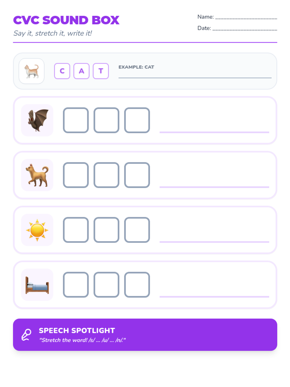 A CVC word recognition worksheet using Elkonin boxes, now including 4 words across different vowel sounds (a, e, o, u) with clear example labeling, darker borders for printing, and a consolidated speech support section.