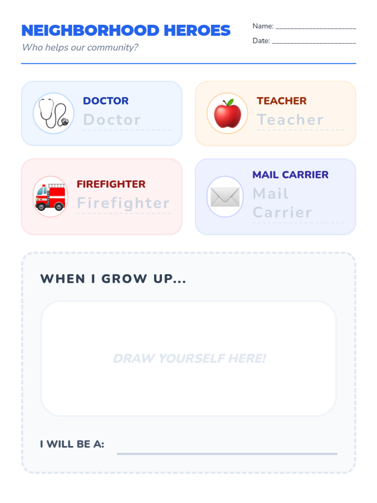 A social studies worksheet for community helpers, featuring high-visibility tracing for role names and a large drawing section.