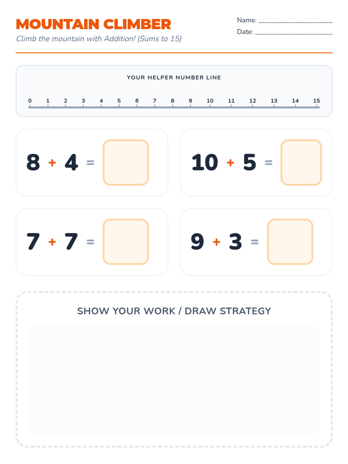 An addition worksheet for sums up to 15, featuring a functional high-contrast number line, square answer boxes, and a dedicated drawing space for visual strategy.