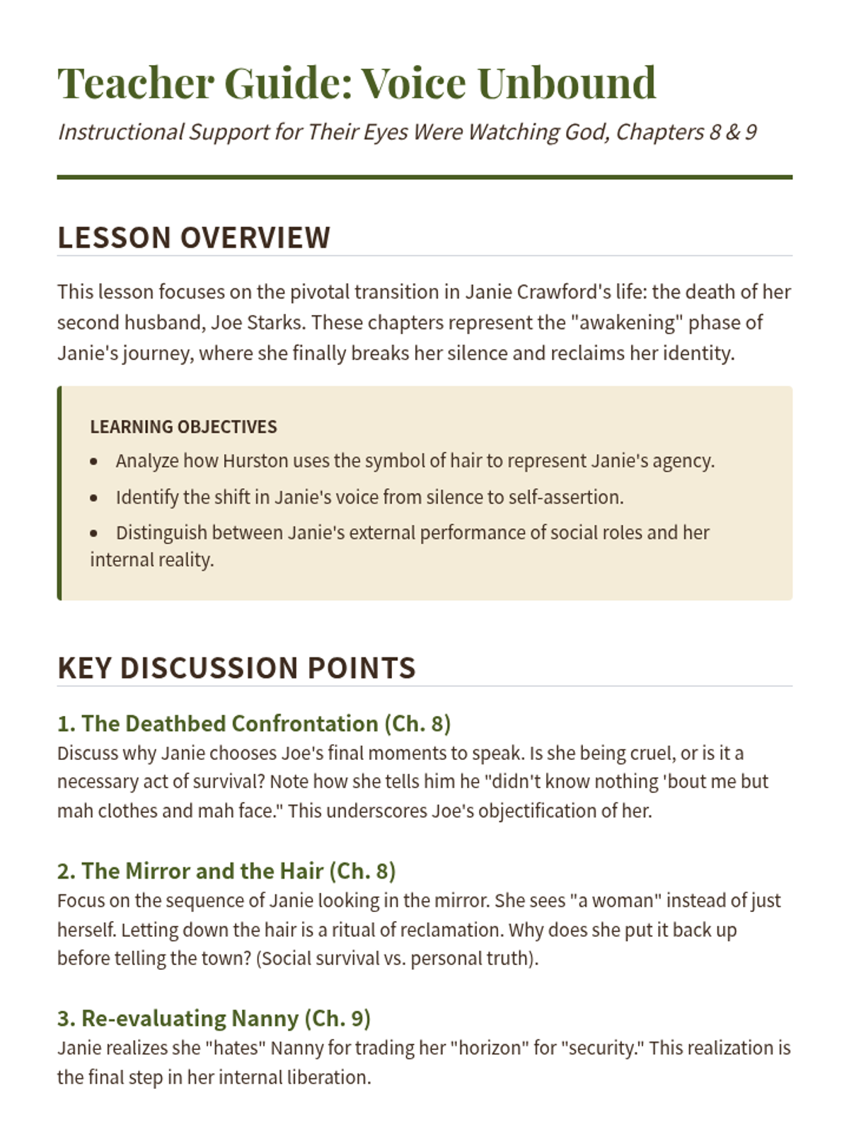 A teacher guide providing instructional strategies, discussion prompts, and learning objectives for teaching Chapters 8 and 9 of 'Their Eyes Were Watching God'. Includes guidance on key symbols and character motivations.