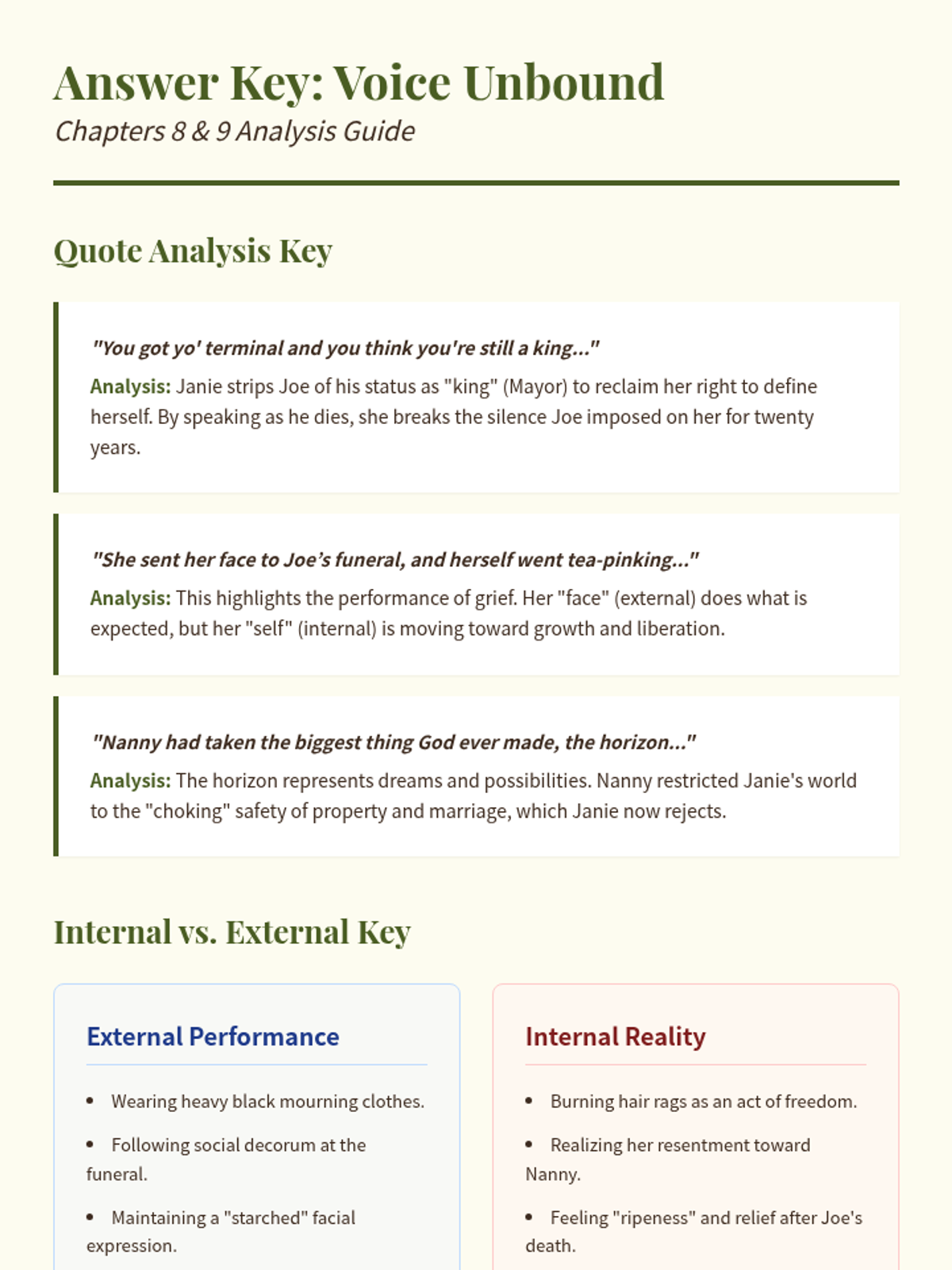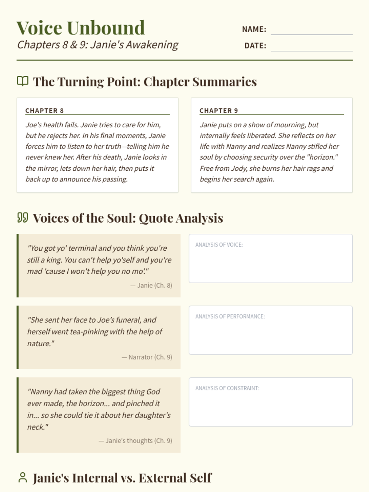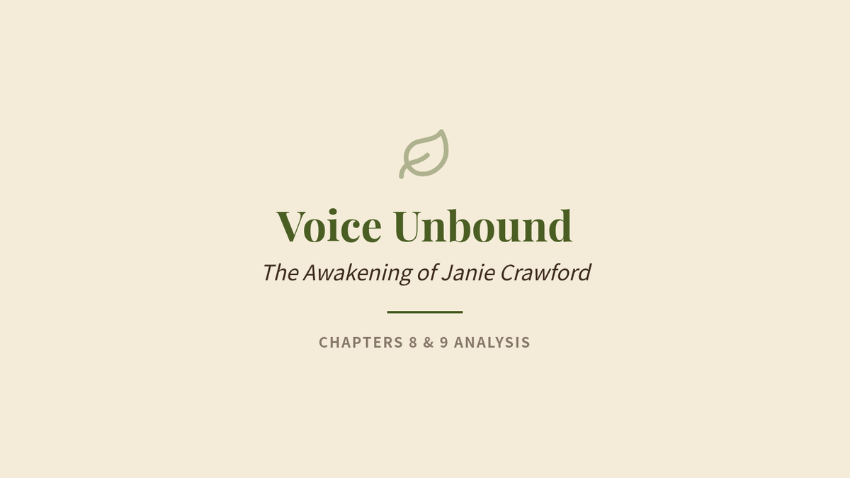 A structured graphic organizer for analyzing Janie's character development, voice, and internal/external conflict in Chapters 8 and 9 of 'Their Eyes Were Watching God'. Includes summaries, key quotes for analysis, and reflection spaces.