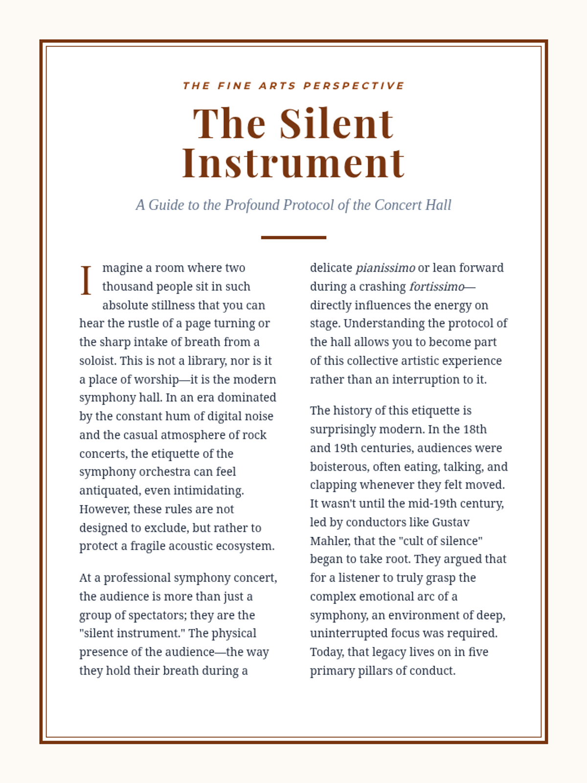 A formal article for high school students explaining the history and practical rules of symphony etiquette, framed as the 'Five Pillars of Protocol'.