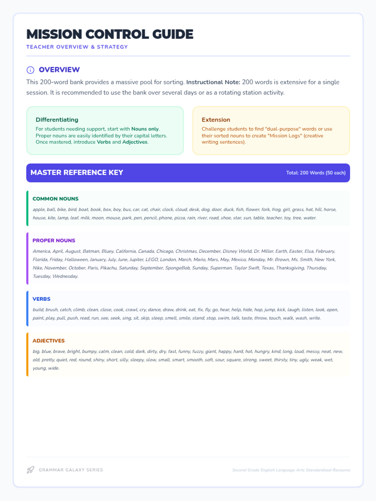 A comprehensive printable list of 200 words (50 per category) including common nouns, proper nouns, verbs, and adjectives, designed with a "Galaxy Word Bank" theme for student engagement. Words are formatted uniformly to ensure the sorting activity requires categorization skills.
