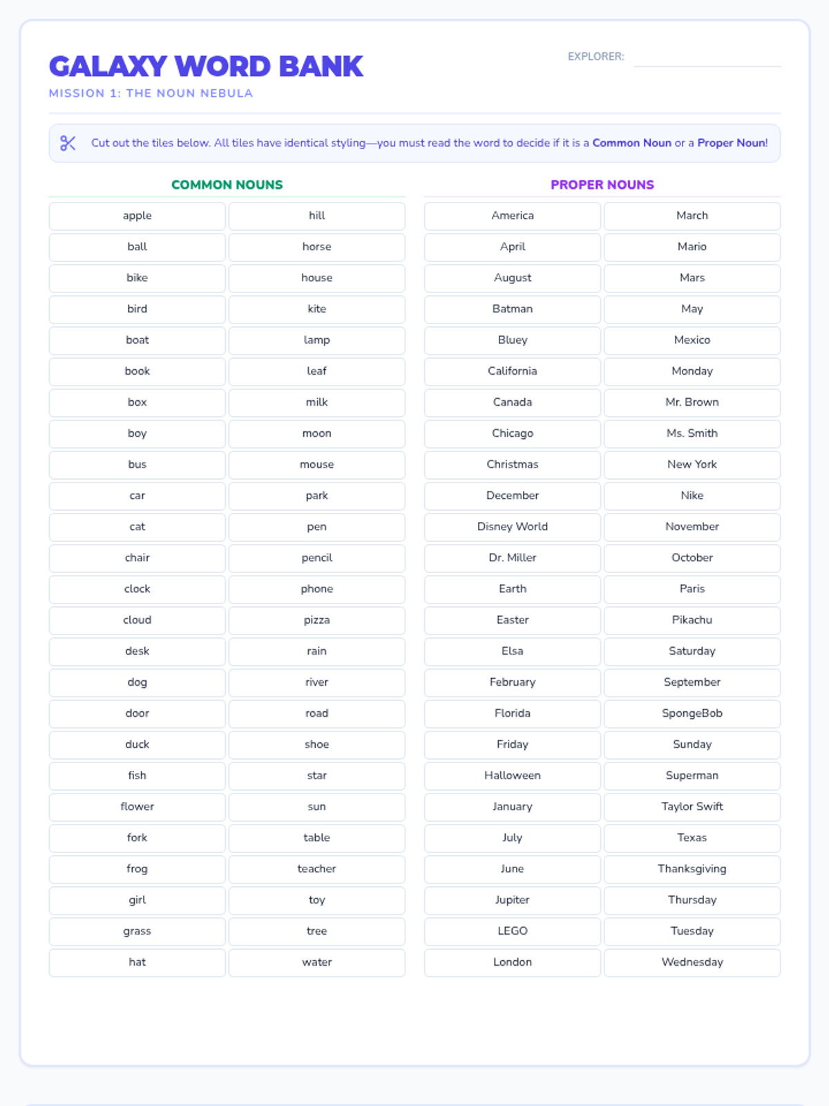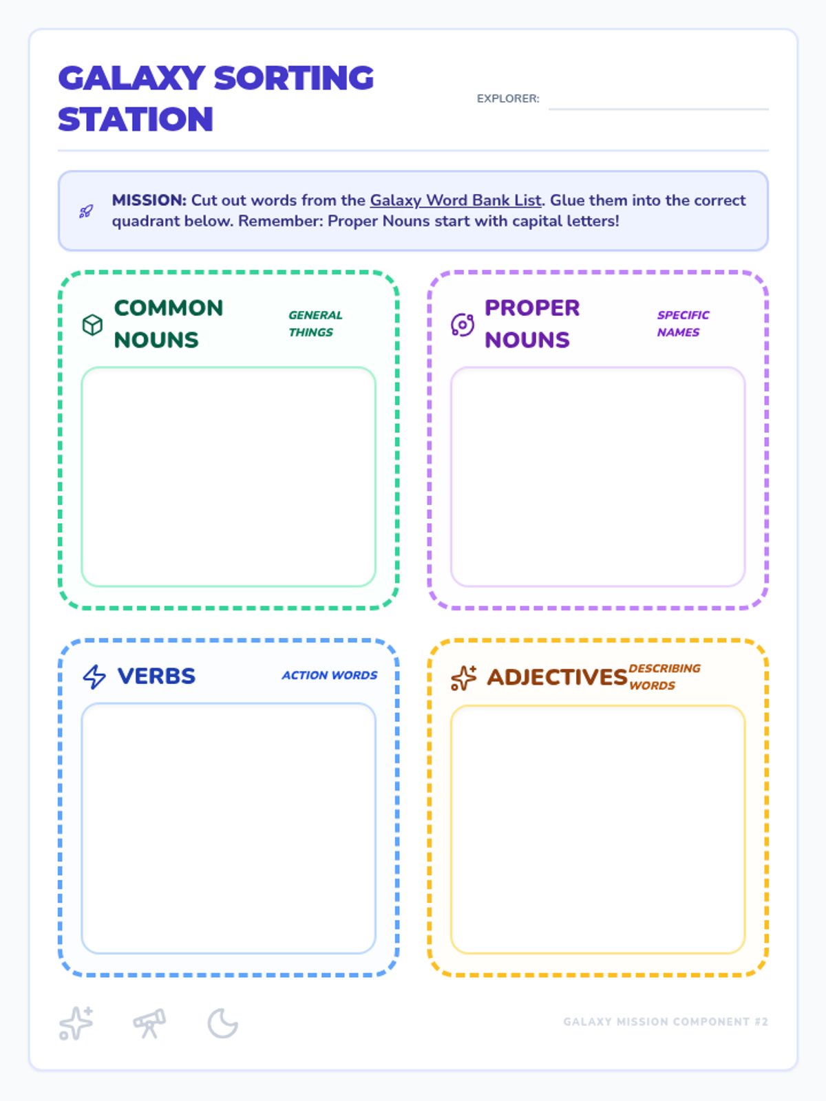 A high-contrast sorting mat for students to glue or write words into four categories: Common Nouns, Proper Nouns, Verbs, and Adjectives. Features reinforced quadrant boundaries and space-themed icons.