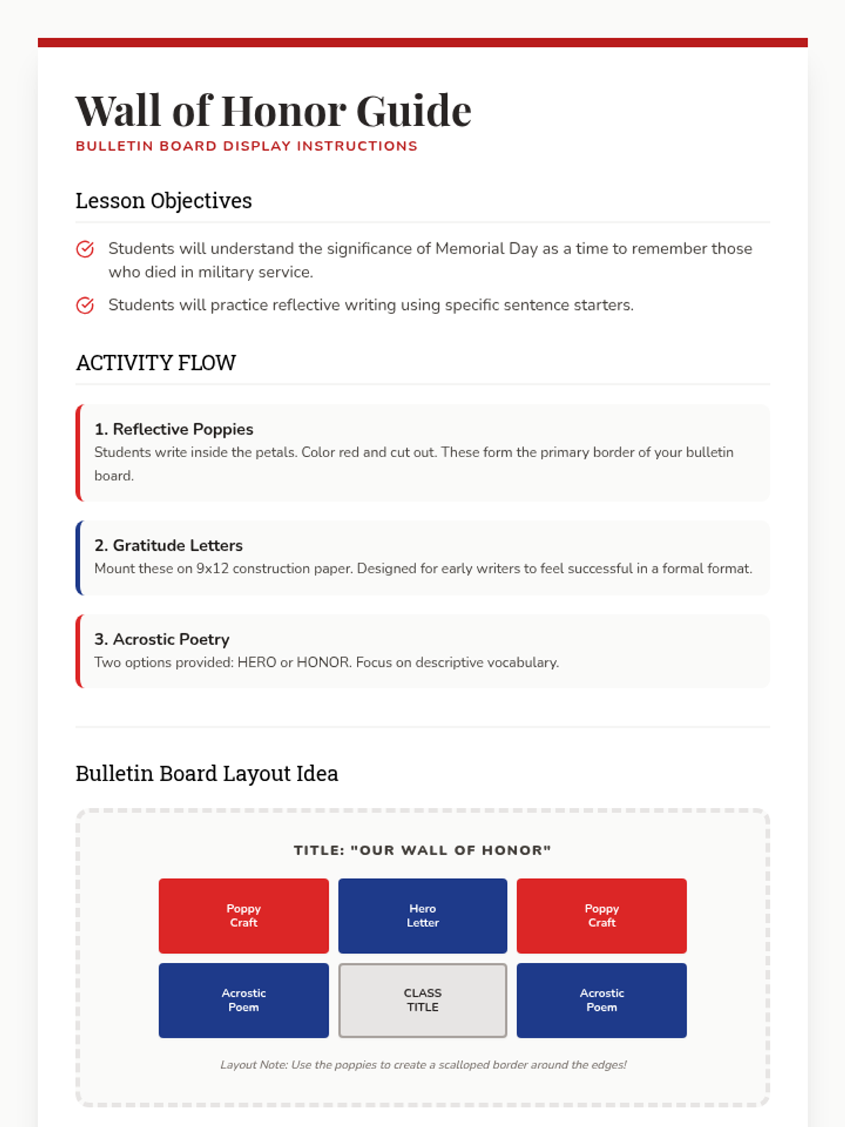 A teacher's guide for organizing and executing a Memorial Day bulletin board project. Revised with more condensed spacing to ensure all content fits on a single page.