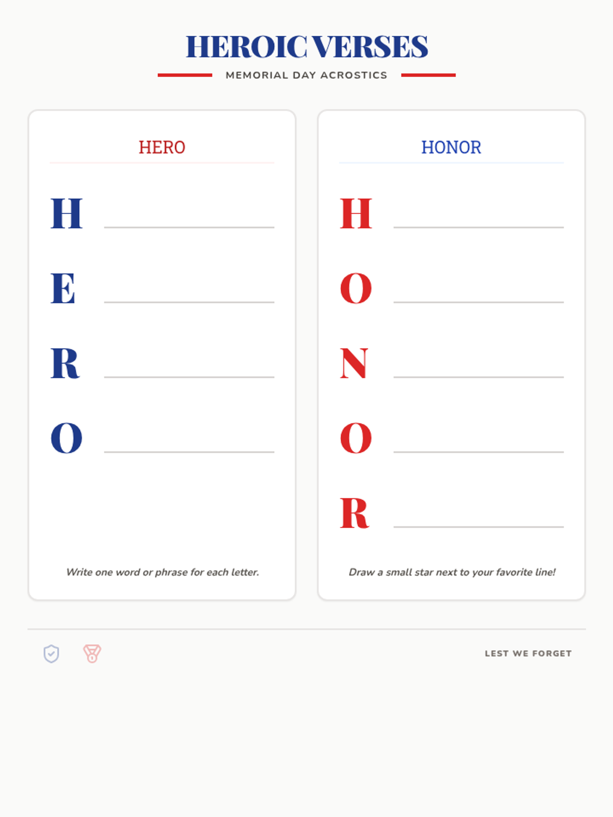 Two acrostic poem templates for the words "HERO" and "HONOR" with large decorative lettering and writing lines. Revised for better contrast, wider writing areas, and single-page fit.