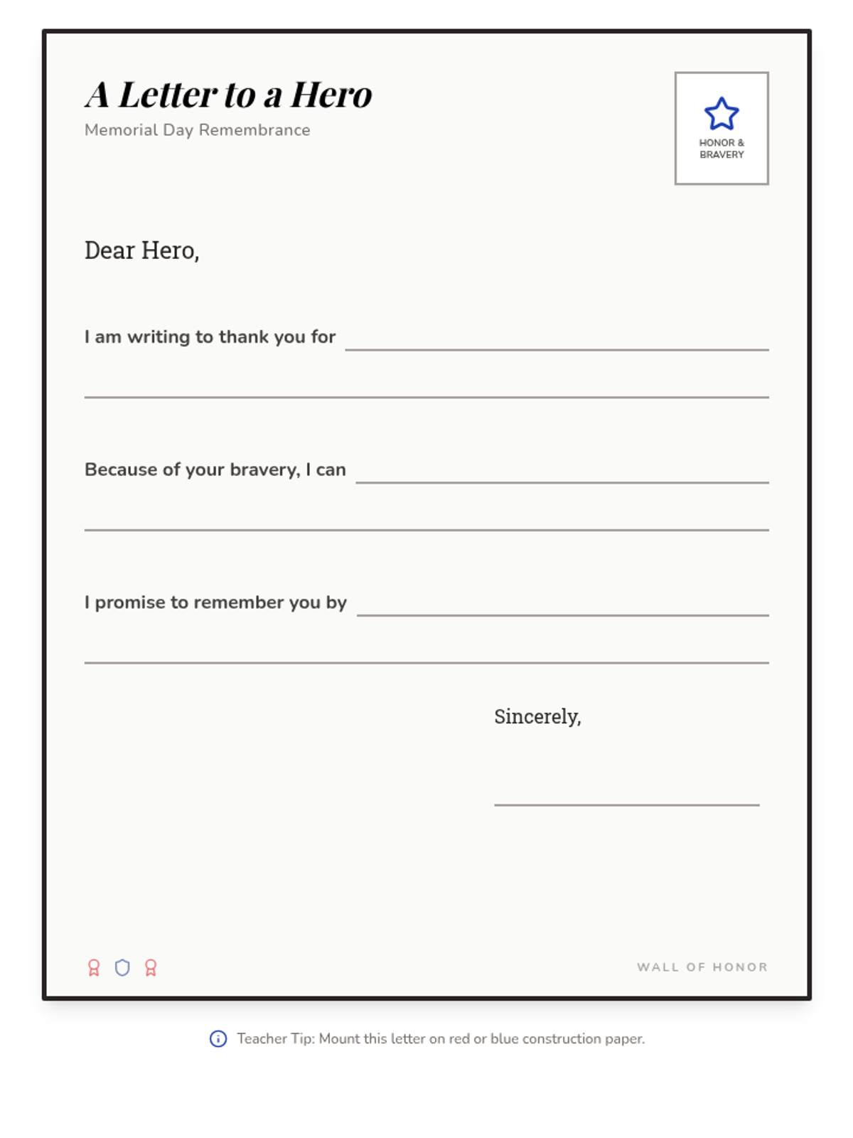 A guided letter-writing template for students to express gratitude to a fallen hero, featuring sentence starters and a formal layout. Revised with condensed spacing to ensure all content and teacher tips fit on a single page.