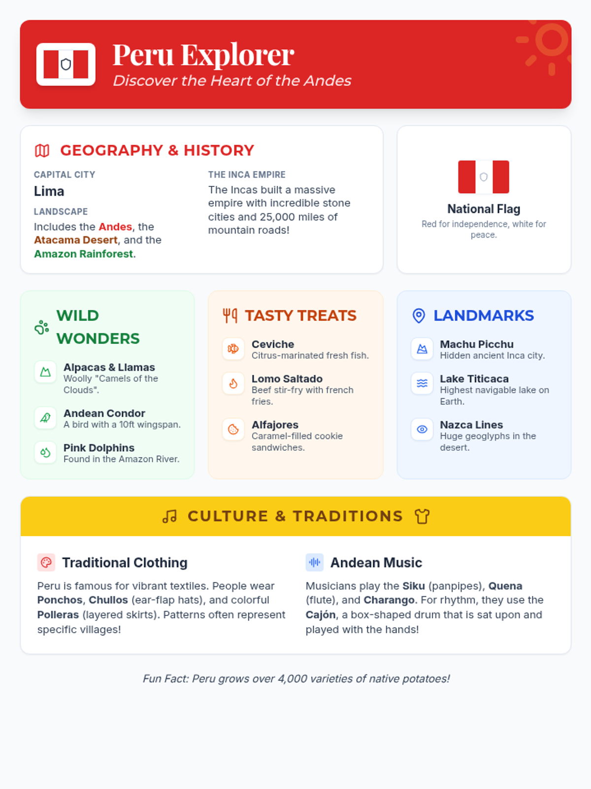 An expanded, infographic-style fact sheet about Peru featuring geography, history, symbols, wildlife, food, landmarks, and cultural traditions. Features multiple examples per category and optimized single-page layout with high-contrast text.