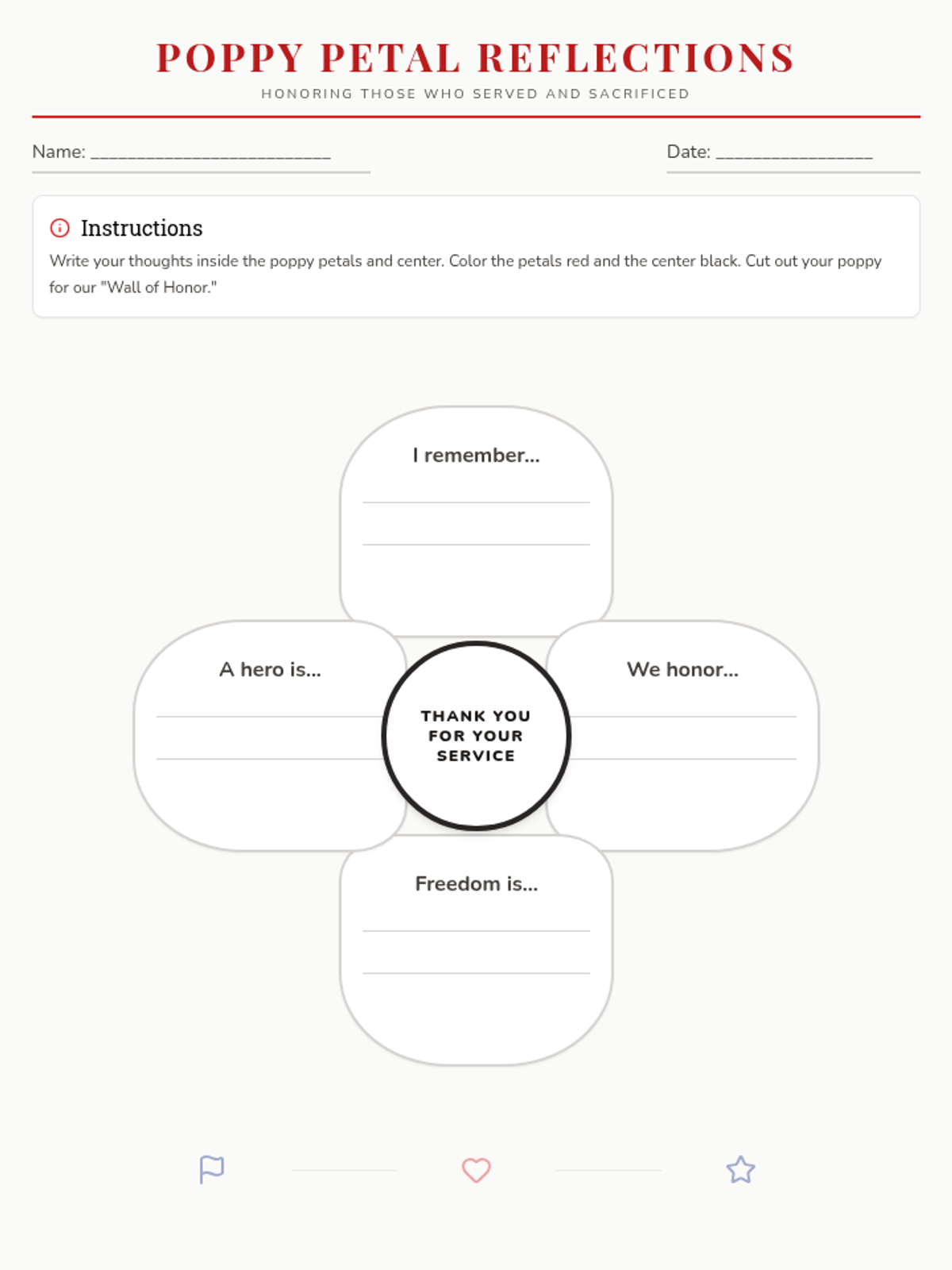 A poppy-themed craft and writing worksheet where students respond to sentence starters inside the petals of a poppy flower. Revised with higher contrast, organic petal shapes, and a single-page layout.
