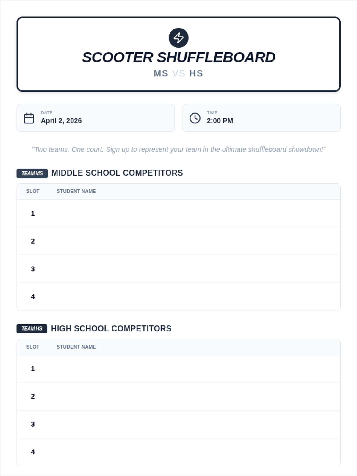 A neutral-toned pep rally sign-up sheet for the Scooter Shuffleboard competition, featuring a 6x8 (3:4) print size and dark, high-contrast slot numbers for maximum legibility.