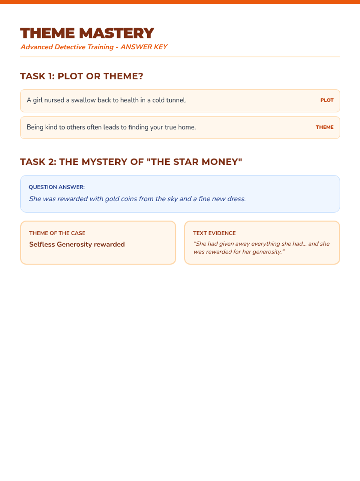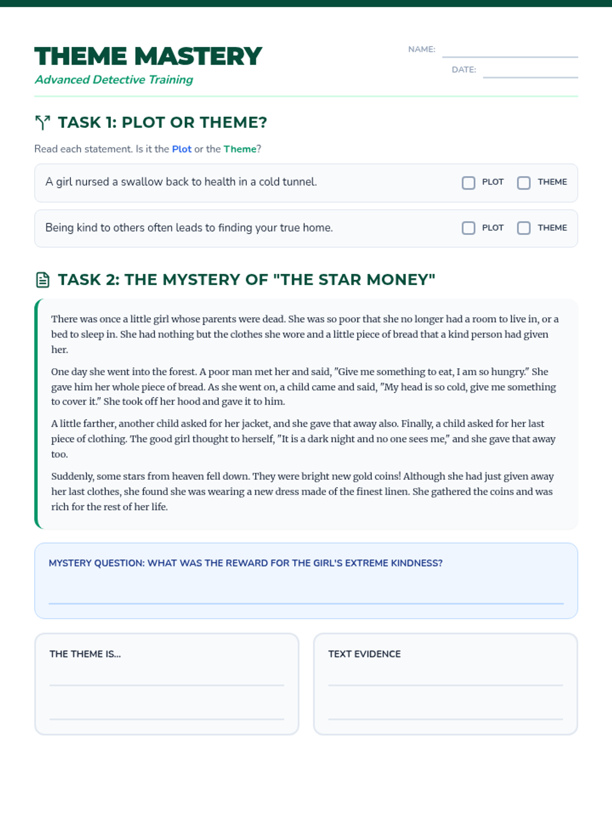An additional practice worksheet focused on identifying themes in a new story, differentiating plot from theme, and reflecting on theme strategies.