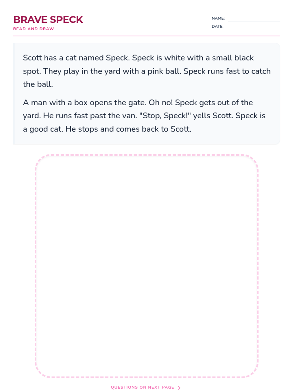 A second student worksheet using the 'Scroll Format'. It features a decodable story about a cat named Speck, a massive square illustration area, and character inference questions on the second page.