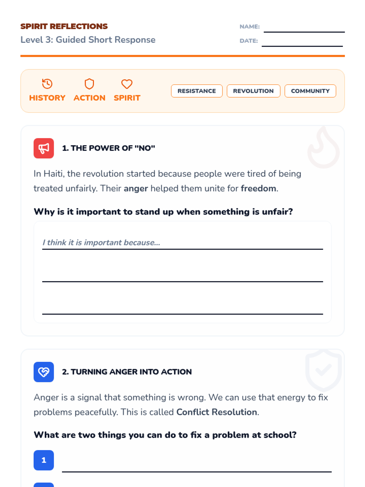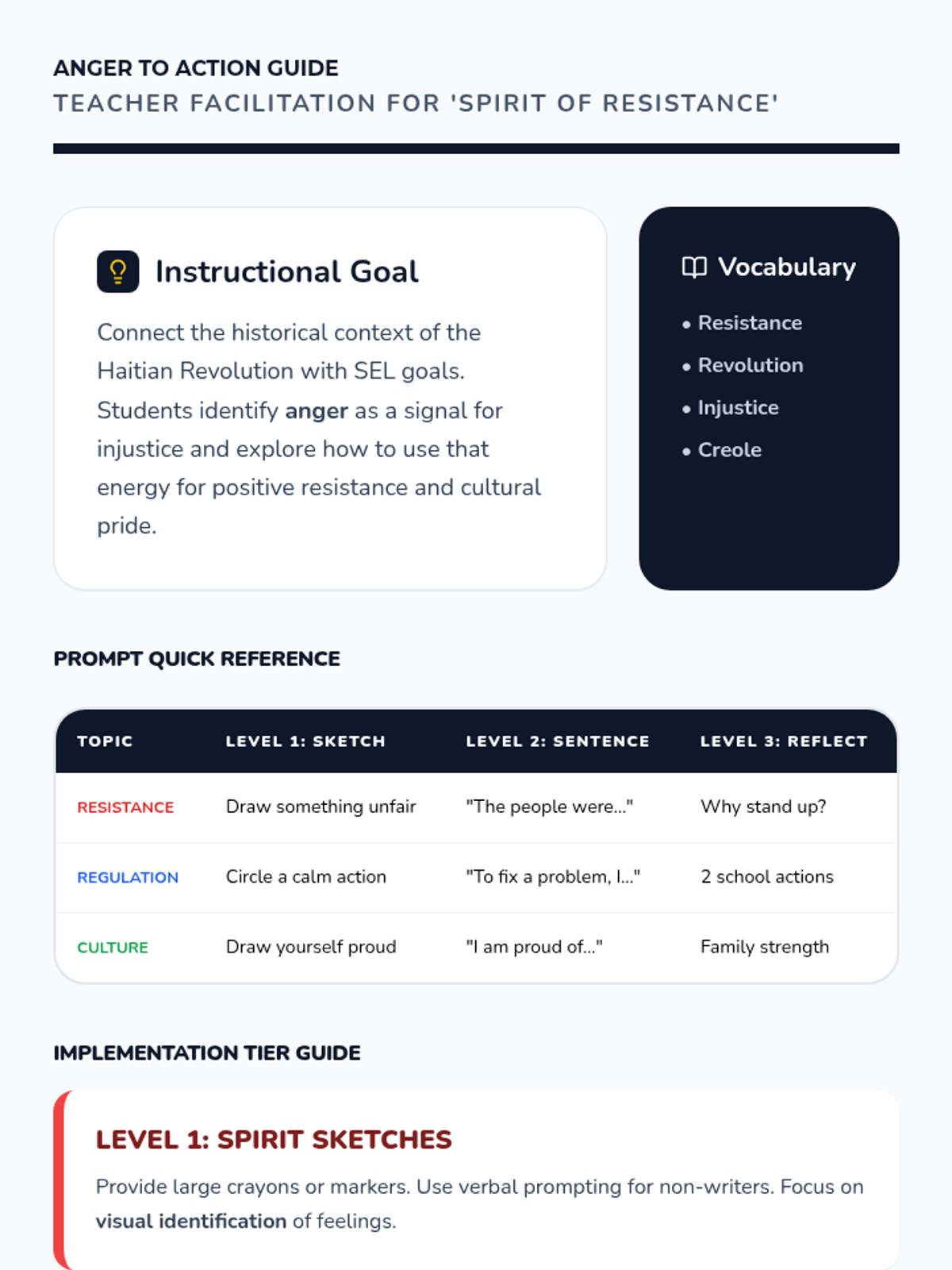 Educational slides introducing the Haitian Revolution, the concept of resistance, managing the emotion of anger, and Creole cultural pride. Designed for IEP students with high contrast and improved vertical distribution.