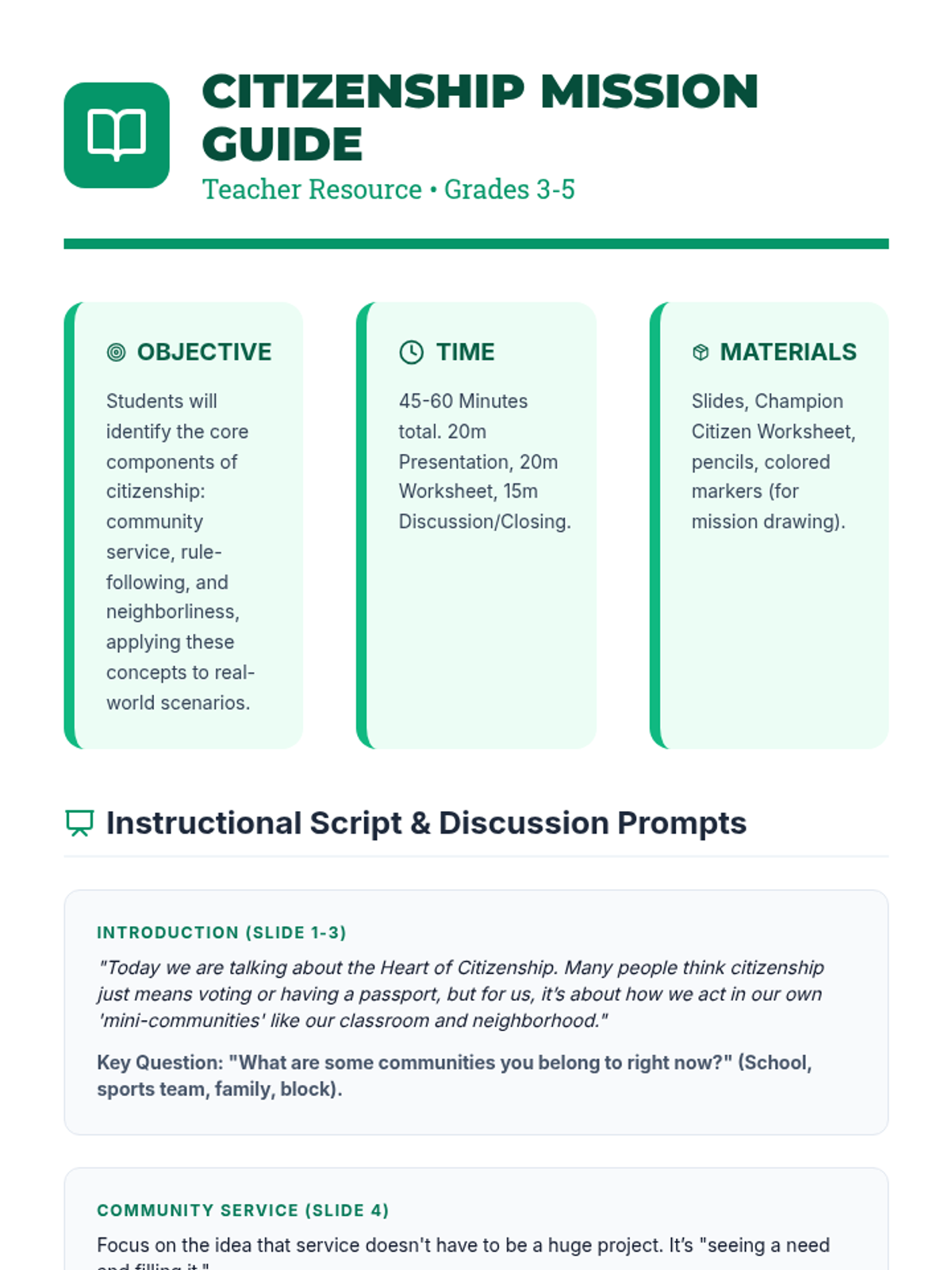 A comprehensive facilitator guide for the Heart of Citizenship lesson, including instructional scripts, discussion prompts, and differentiation strategies.