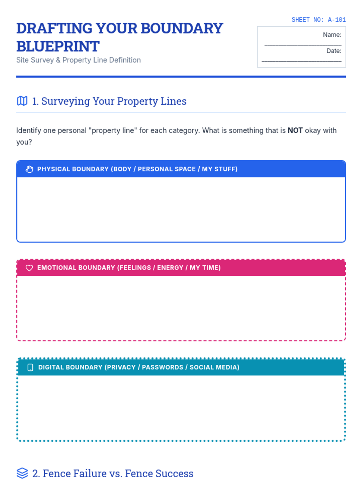 A student drafting worksheet for 'The Boundary Blueprint' lesson. Revised to increase handwriting space, fix page breaks, and improve visual hierarchy for black and white printing.