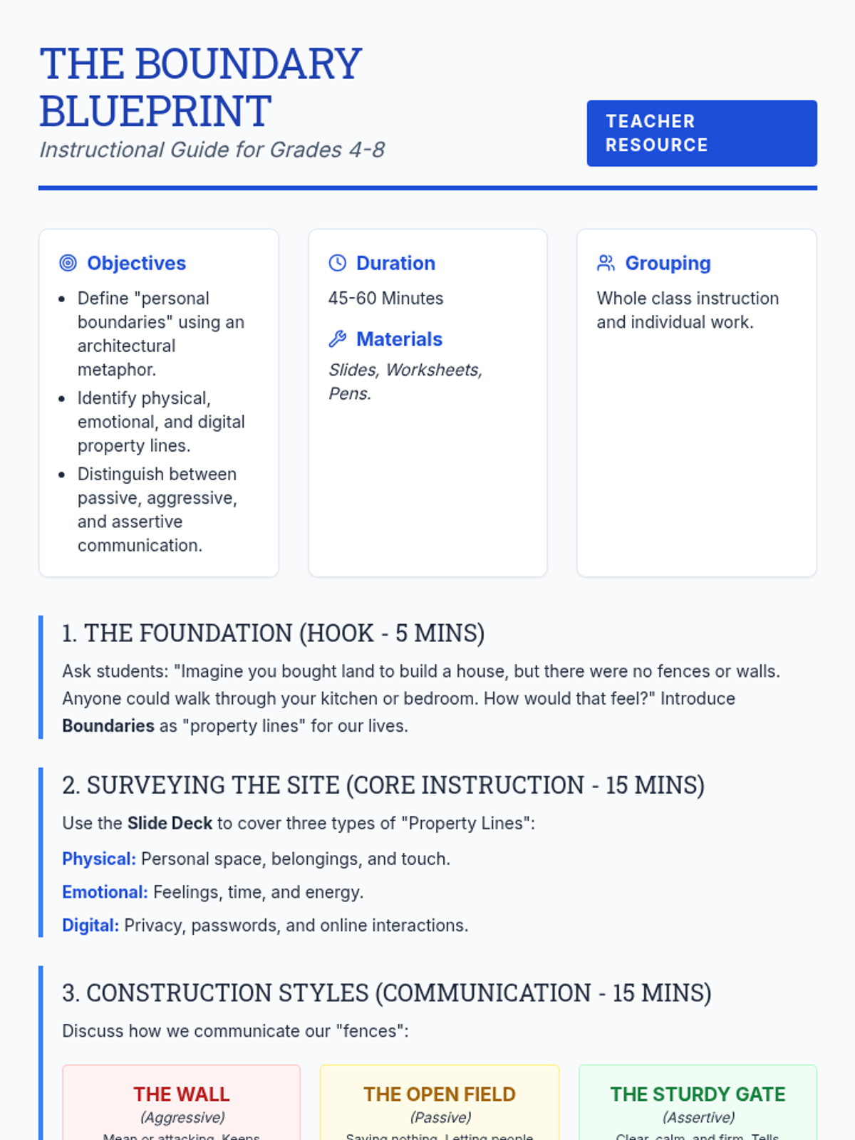 Comprehensive lesson plan for 'The Boundary Blueprint', including objectives, timing, hook, core instruction, activity, and closing for grades 4-8. Revised to fix page breaks and add enrichment.