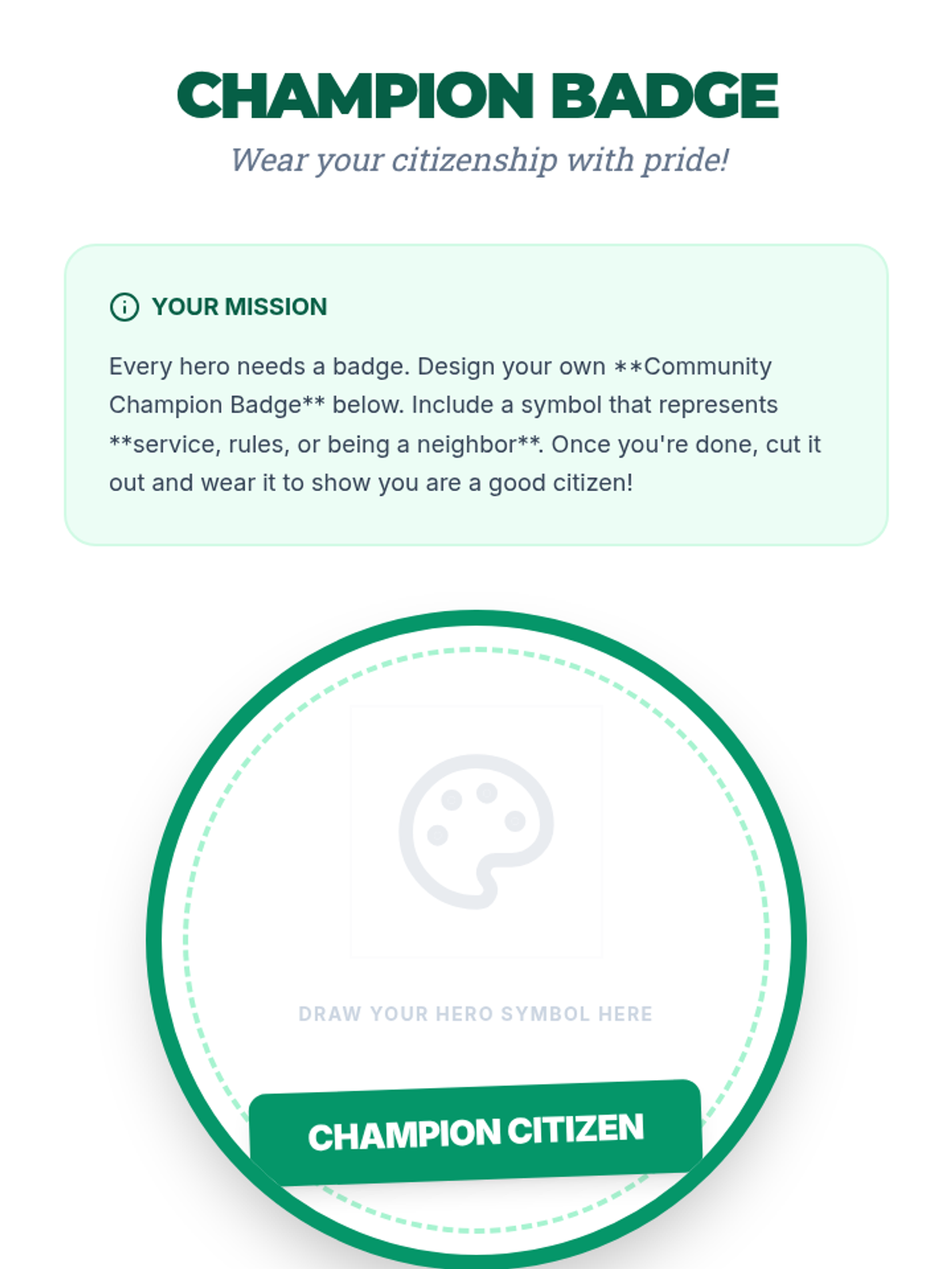 A creative hands-on activity for students to design their own citizenship badge, reinforcing the visual identity of being a "Community Champion."