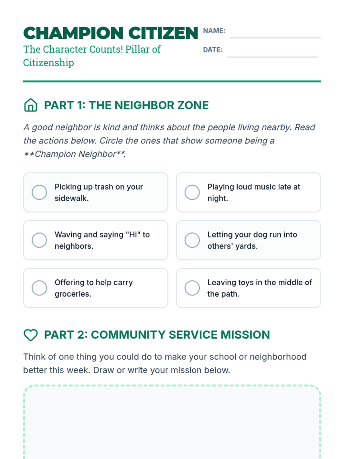 A student worksheet for grades 3-5 that encourages reflection on being a good neighbor, brainstorming community service projects, and understanding the purpose of rules.