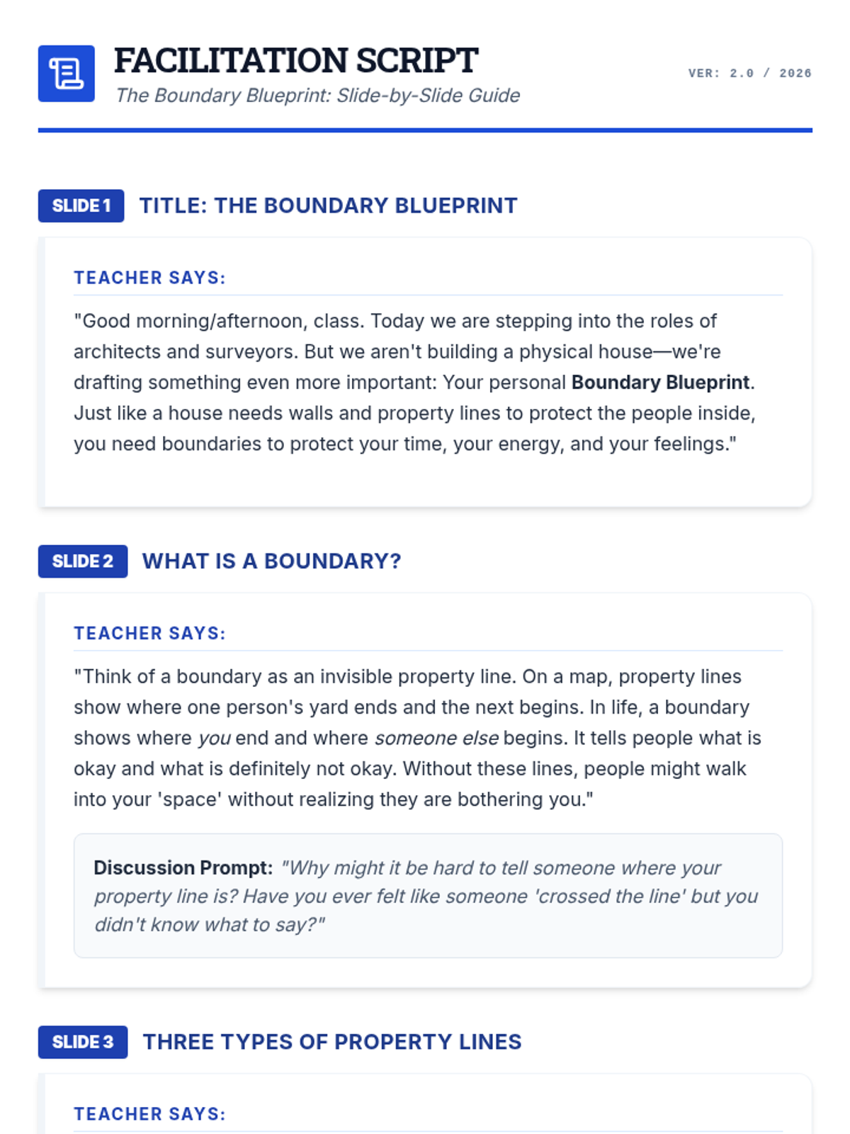 A detailed facilitation script for 'The Boundary Blueprint' slide deck. Revised to fix page breaks, improve label legibility, and add helpful teacher prompts.