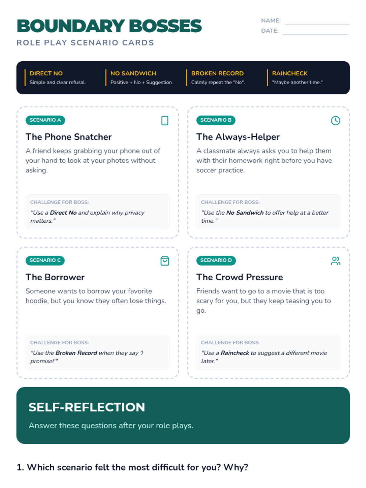 Printable role-play cards featuring four realistic scenarios for practicing personal boundary setting, along with a student reflection section.