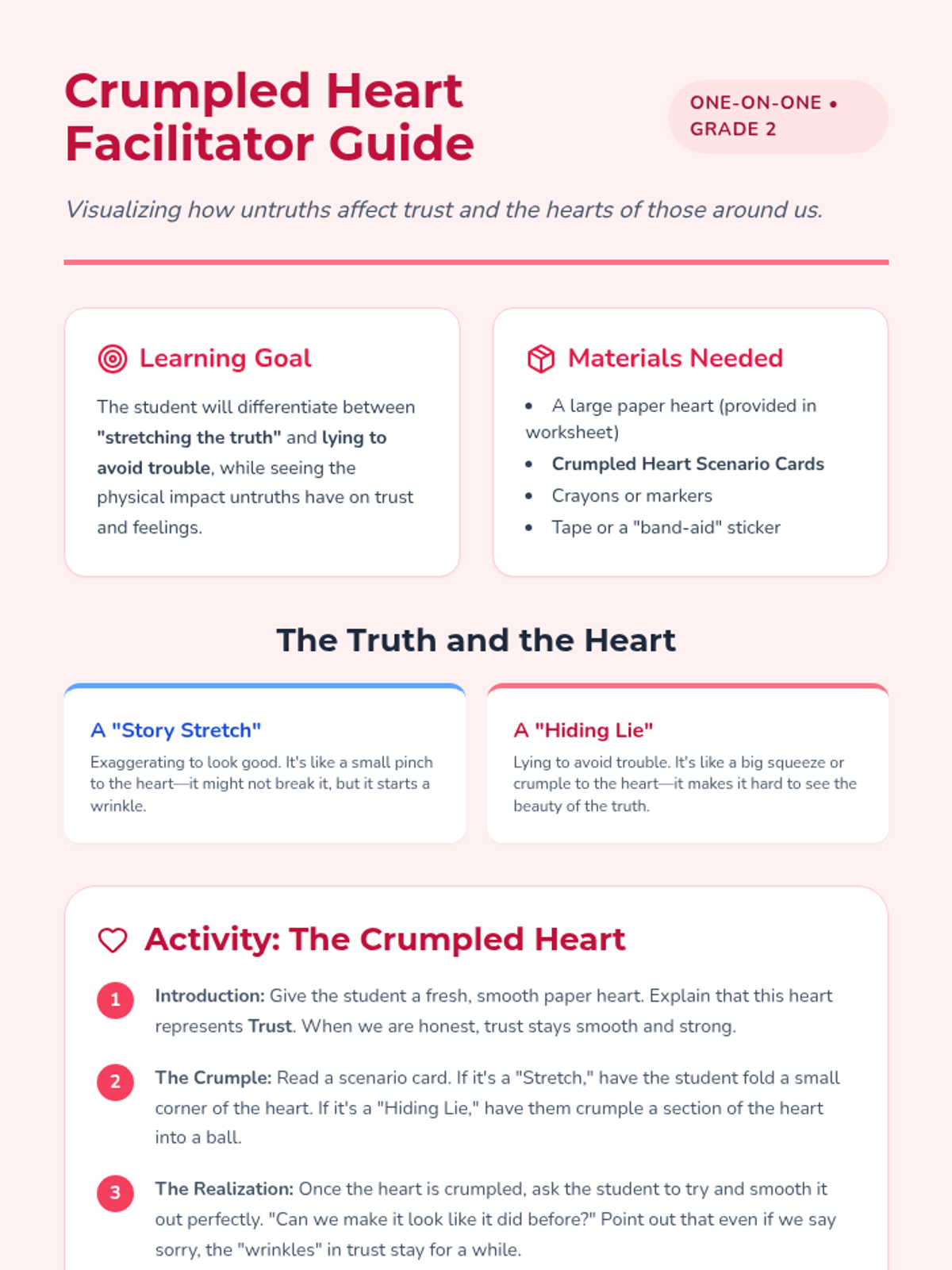 A teacher's guide for the 'Crumpled Heart' activity, using a paper heart to demonstrate how untruths affect trust and relationships.