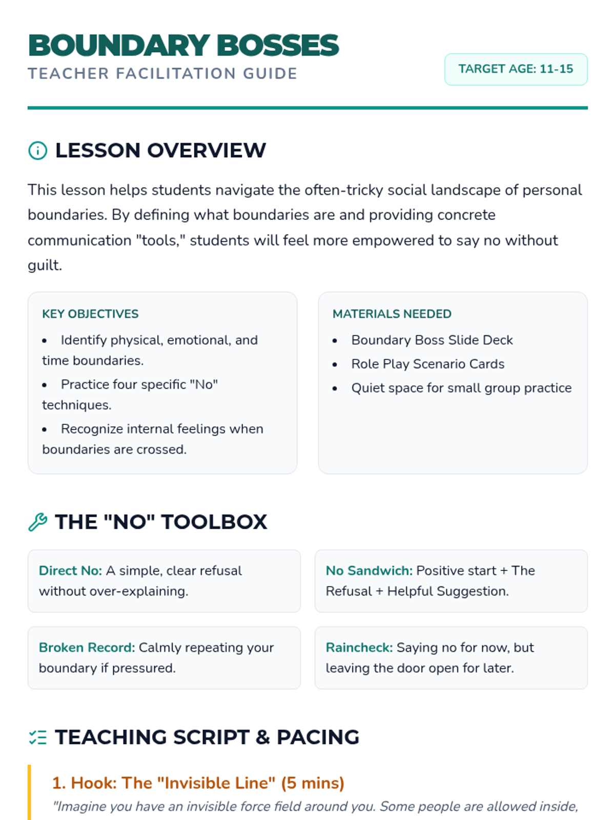 A comprehensive teacher guide for facilitating the Boundary Bosses lesson, including teaching scripts, discussion prompts, and role-play management tips.