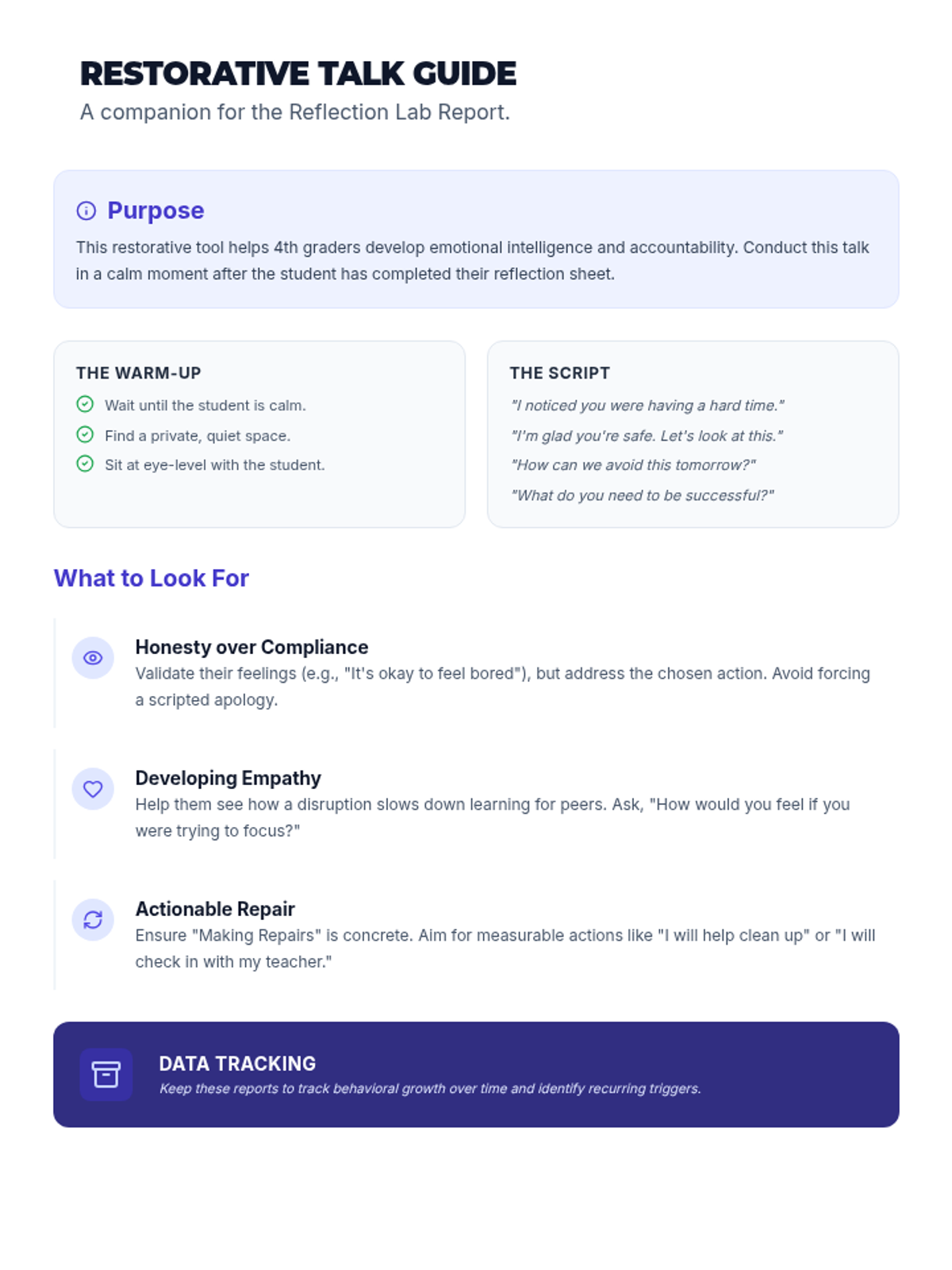 A facilitation guide for teachers to use when reviewing the Reflection Lab Worksheet with students, focusing on restorative justice principles and data collection.