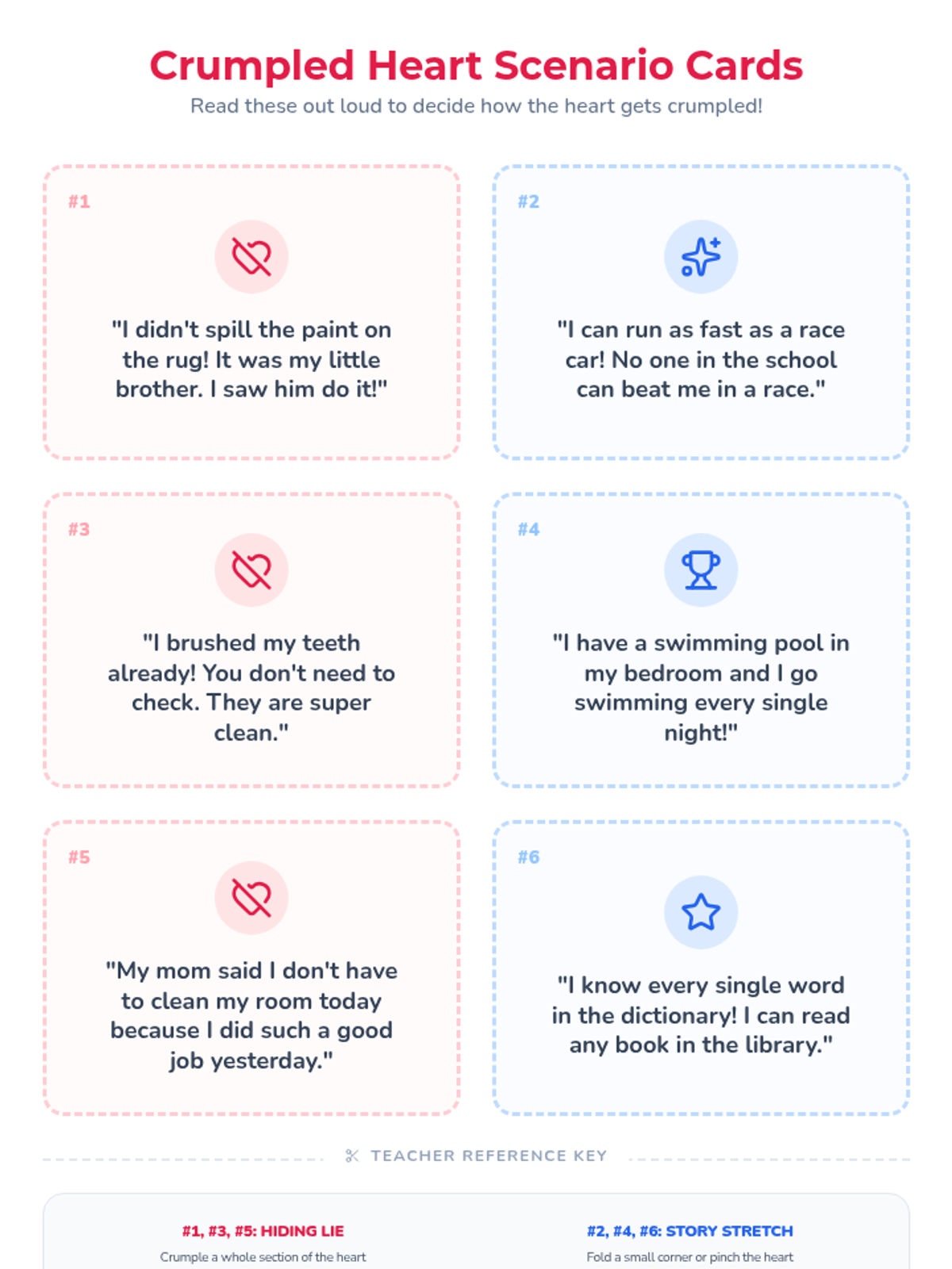 Scenario cards for the 'Crumpled Heart' activity, featuring exaggerations and lies told to avoid trouble, helping students decide how to fold or crumple their trust heart.