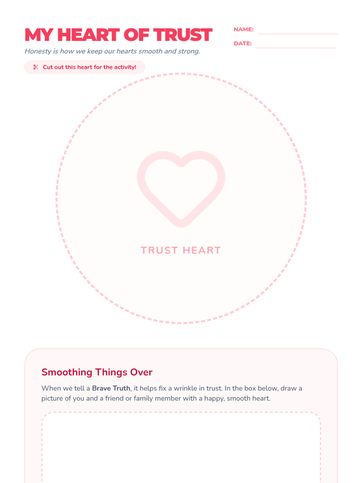 A visual slide deck for the 'Crumpled Heart' activity, illustrating how honesty keeps trust smooth and untruths create wrinkles.