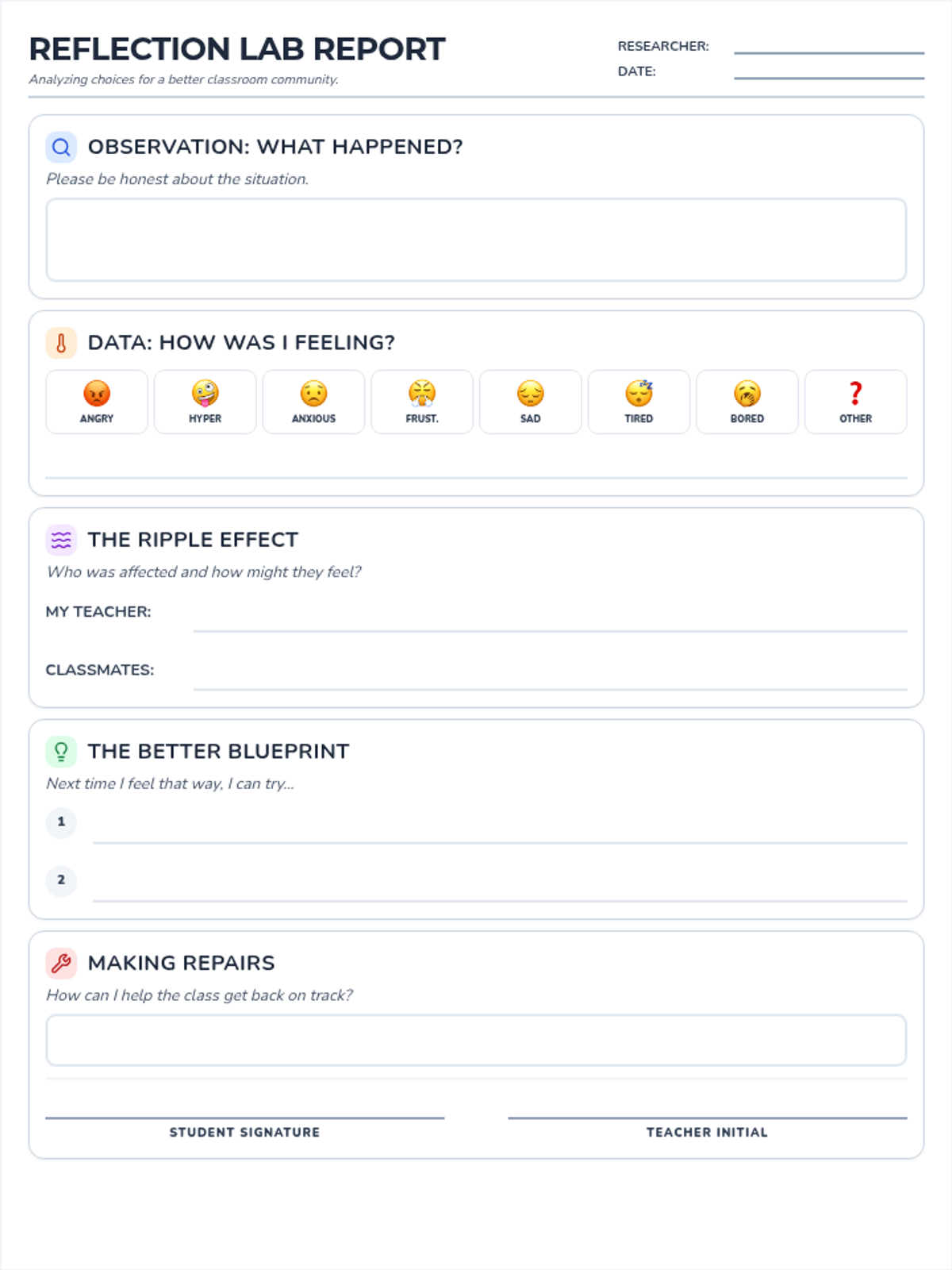 A condensed, one-page reflection worksheet for students to process classroom incidents, identifying feelings, impact on others, and future strategies.