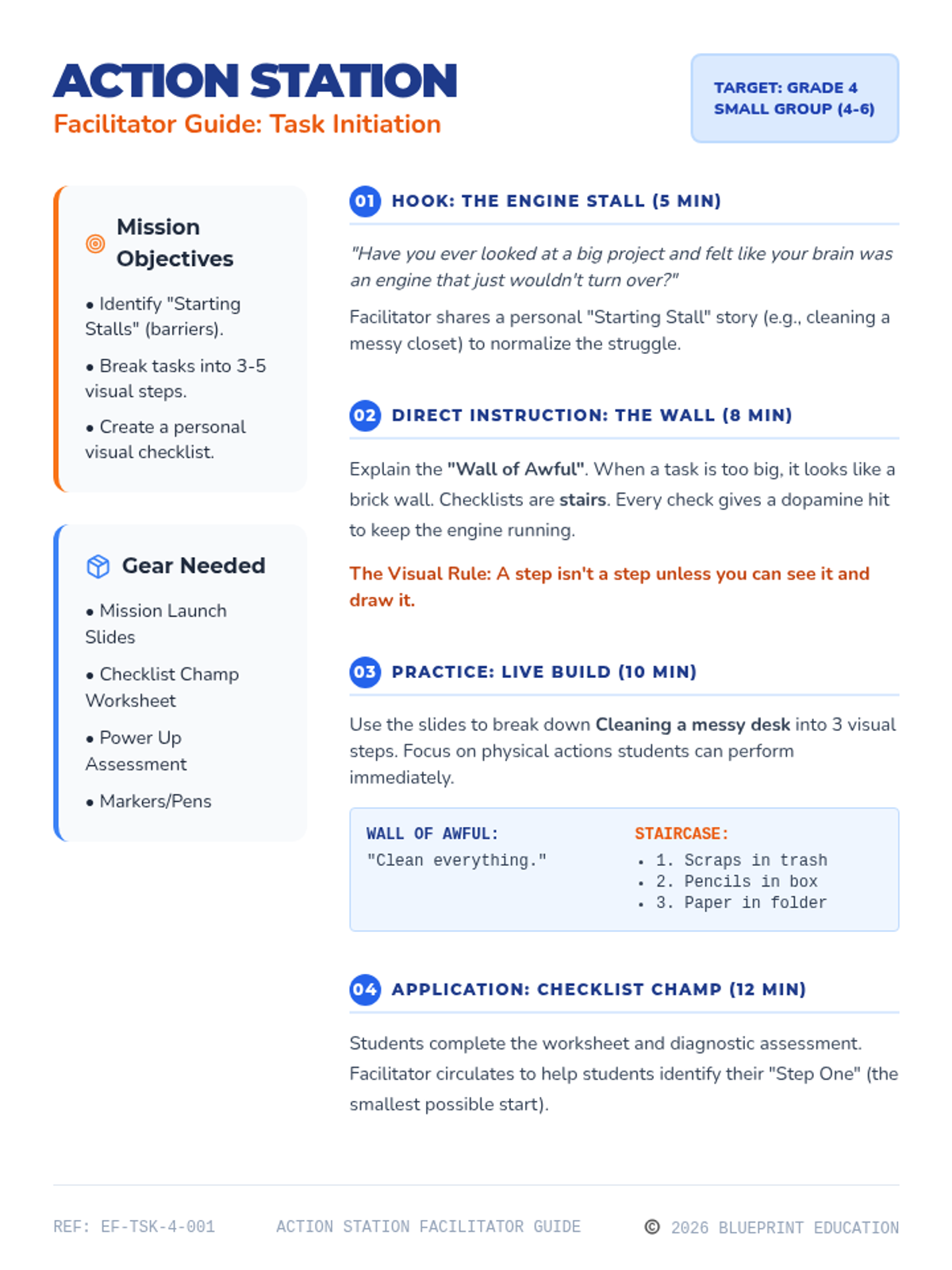 A comprehensive lesson plan for educators focusing on teaching task initiation strategies to 4th-grade students through the use of visual checklists.