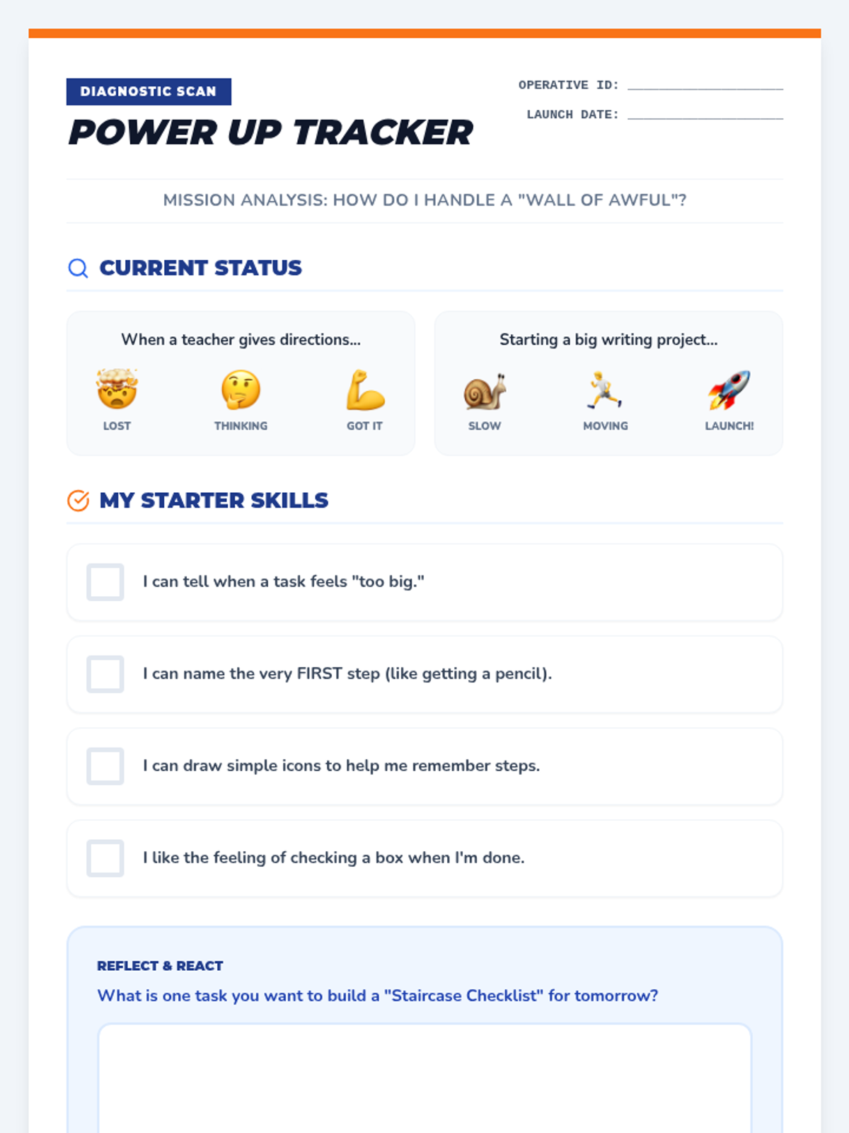 A diagnostic self-assessment checklist for students to identify their current task initiation habits and confidence levels with executive functioning strategies.
