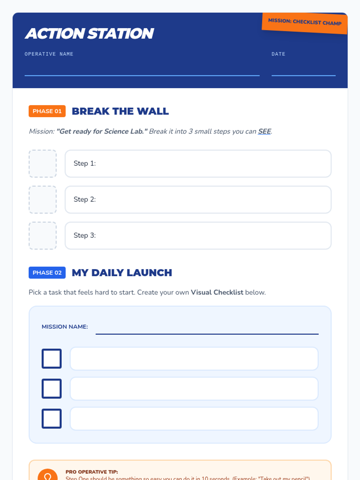 A student worksheet with interactive activities for breaking down complex tasks and designing a personalized visual checklist to improve task initiation.