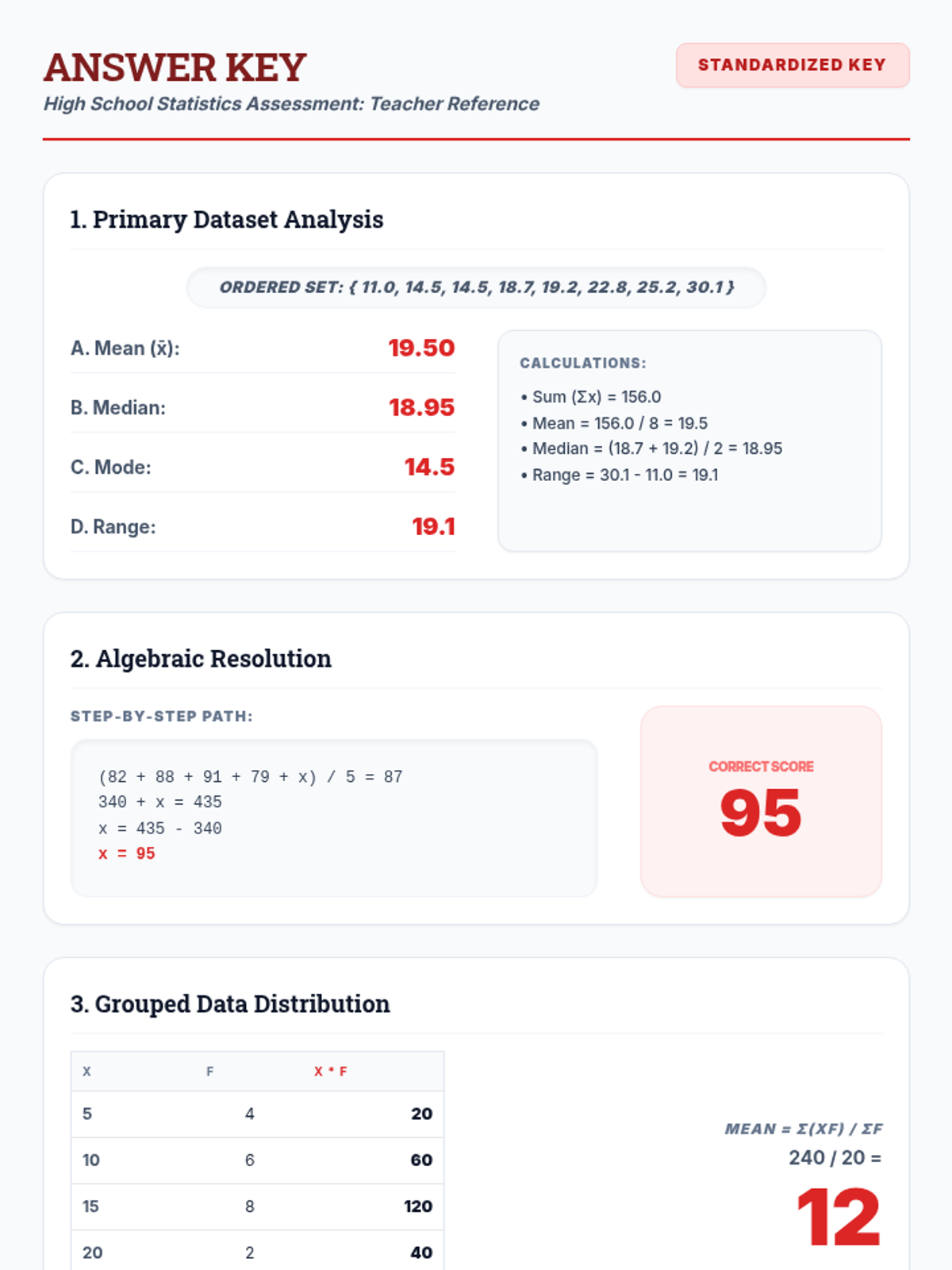 Answer key for the high-school statistics test, featuring detailed algebraic steps, frequency table summations, and conceptual justifications. Standardized layout for better teacher reference.