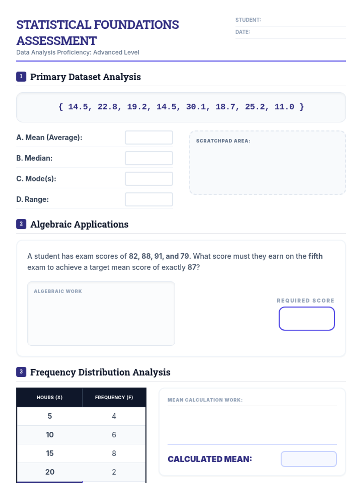 A comprehensive high-school level statistics assessment covering central tendency, algebraic solving, frequency tables, and outlier analysis with a professional academic aesthetic. Revised for improved layout and student writing space. Unicode mean symbol used for stability.