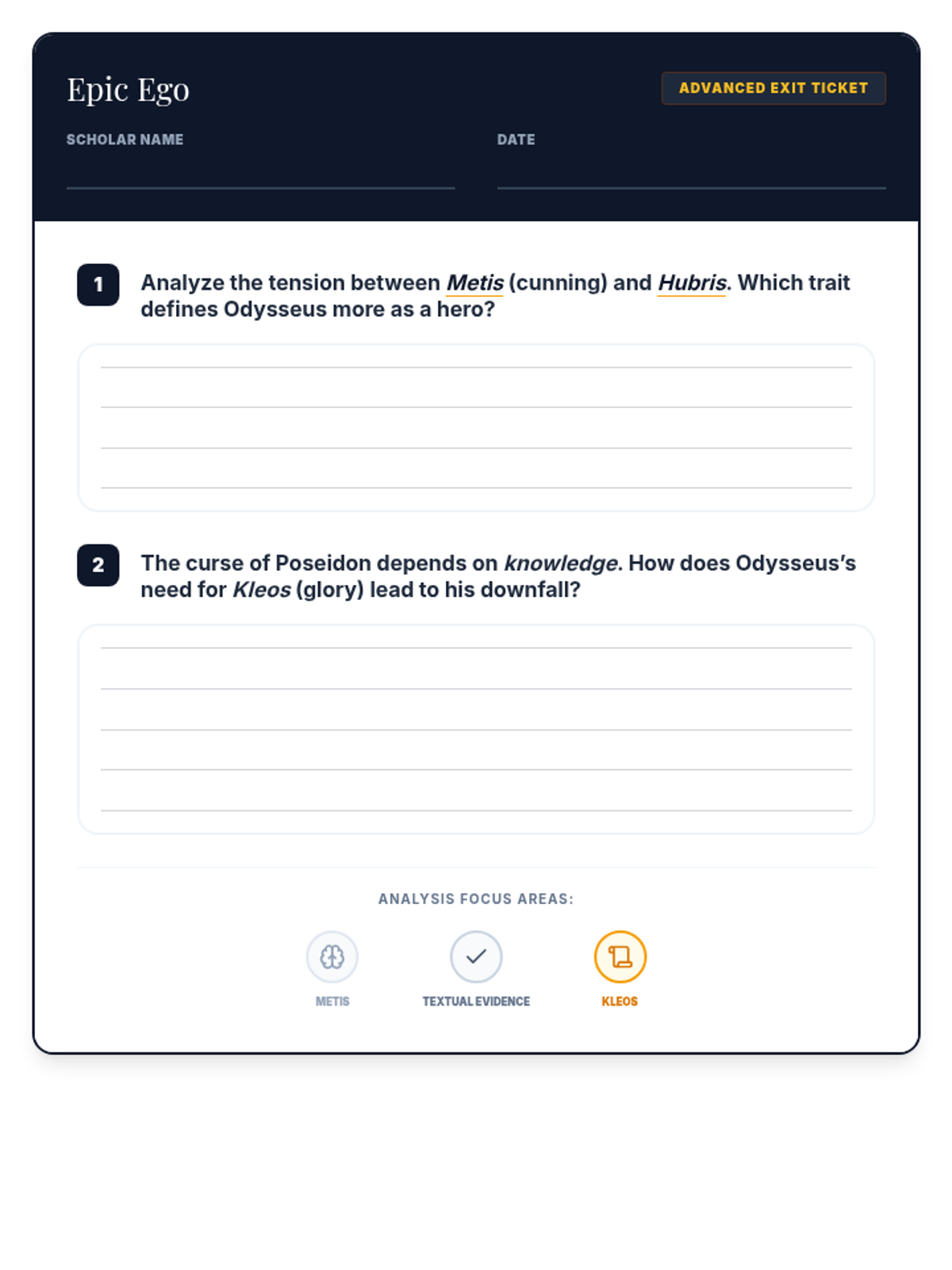 An advanced exit ticket for the Cyclops encounter, requiring students to analyze the conflict between cunning and pride through a literary lens.