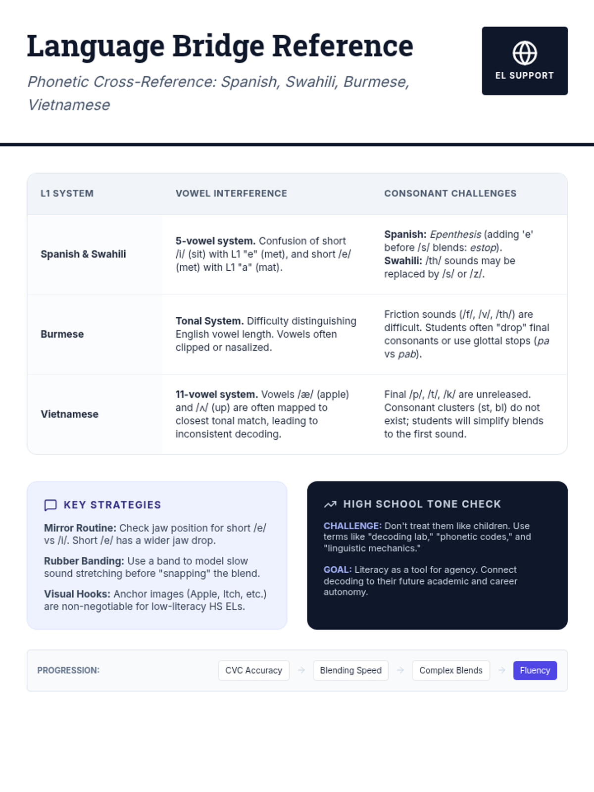 A consolidated one-page cross-reference sheet identifying phonetic challenges for speakers of Spanish, Swahili, Burmese, and Vietnamese.