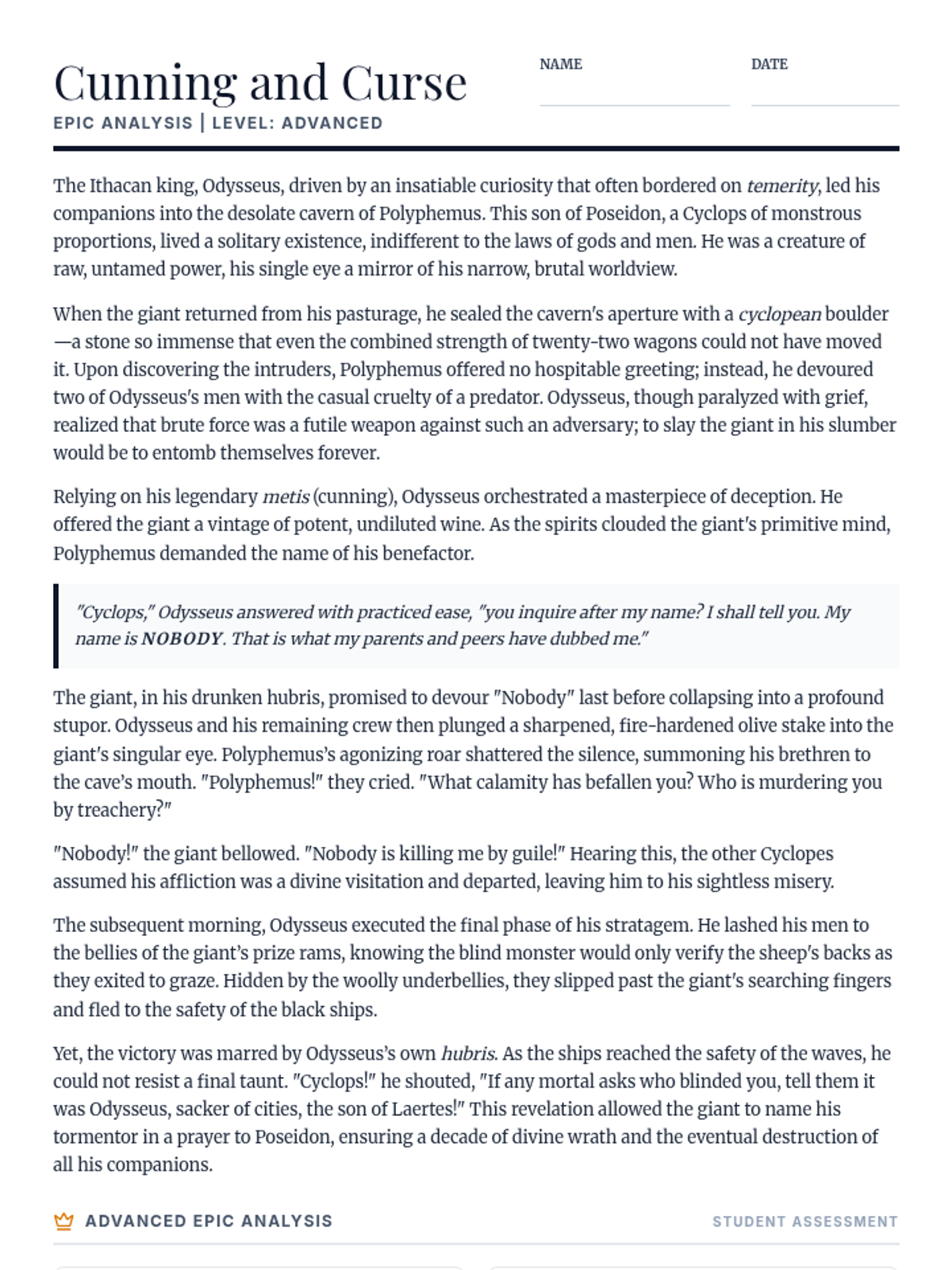 An advanced reading passage about Odysseus and the Cyclops, featuring complex vocabulary, literary analysis of irony, and the hero's paradox.
